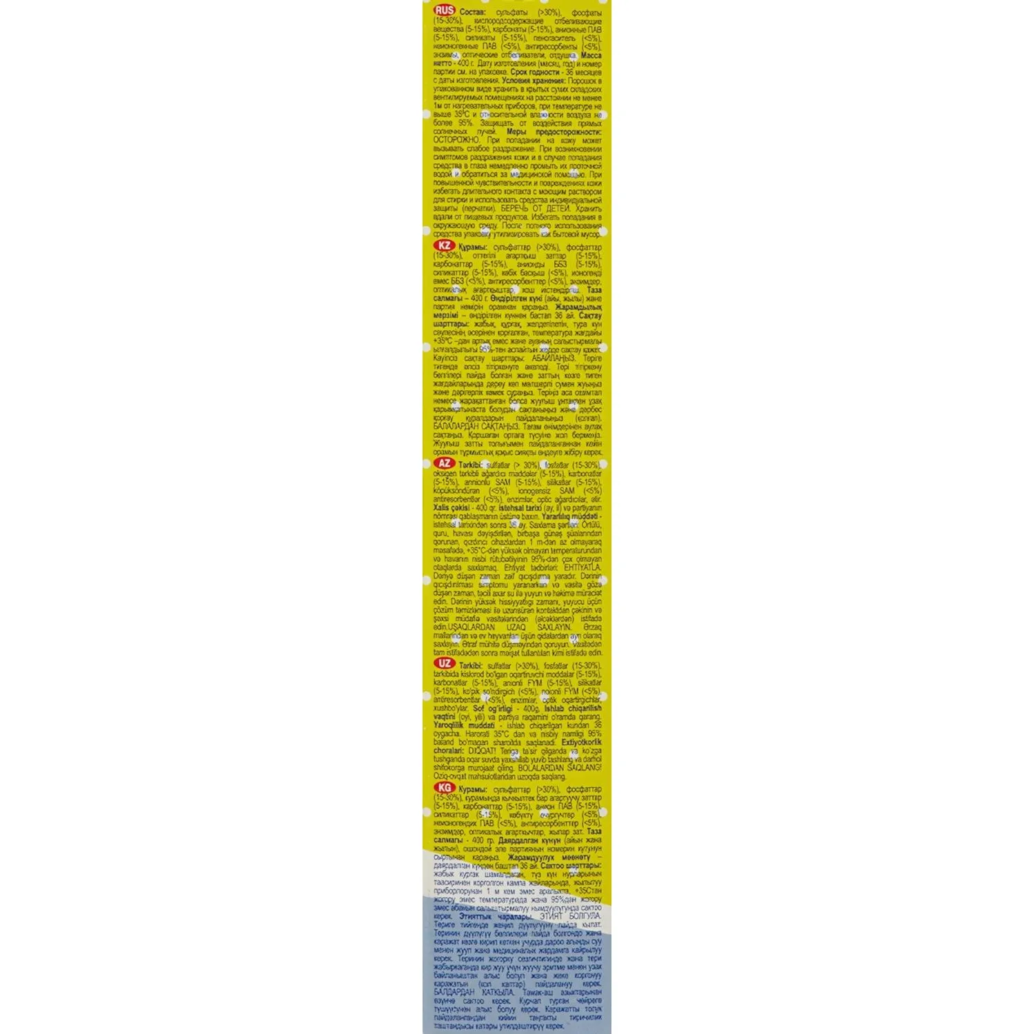 Состав: 15-30% кислородсодержащий отбеливатель; 5-15%: фосфаты, анионые ПАВ; <5%: ТАЕД, неионогенные ПАВ; оптический отбеливатель.