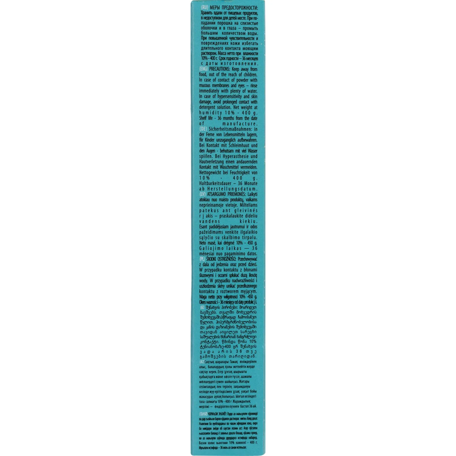 Меры предосторожности: при повышенной чувствительности и повреждениях кожи следует избегать длительного контакта с моющим раствором. В случае попадания стирального порошка на слизистую оболочку глаз, немедленно промыть проточной водой. Беречь от детей.