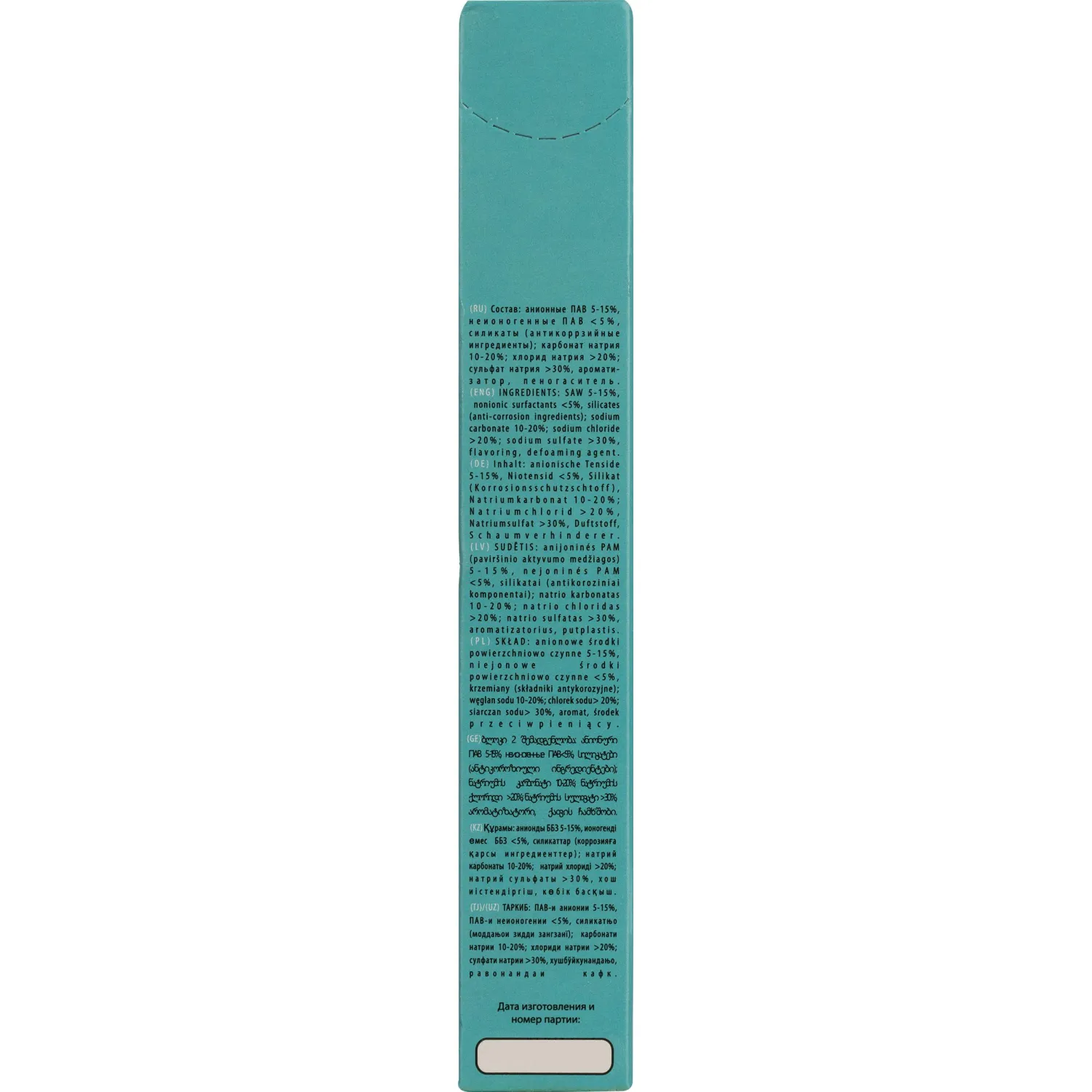 Состав: анионные ПАВ 5-15%, неионогенные ПАВ<5%, силикаты (антикоррозийные ингредиенты); карбонат натрия 10-20%; хлорид натрия>20%; сульфат натрия >30%, ароматизатор, пеногаситель.
