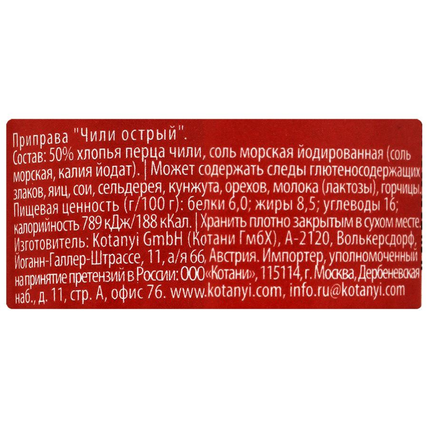 Приправа Kotanyi «„Чили острый“» отлично подойдет для приготовления блюд из мяса, рыбы, птицы, овощей, супов, морепродуктов, легких соусов, яиц.