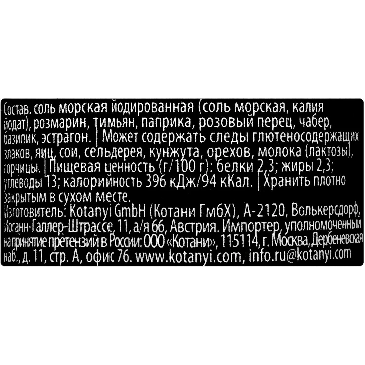 Состав: Розмарин, Тимьян, Паприка, Перец розовый, Чабер садовый, Эстрагон, Базилик. Может содержать следы глютеносодержащих злаков, яиц, сои, сельдерея, кунжута. орехов, молока (лактозы), горчицы.