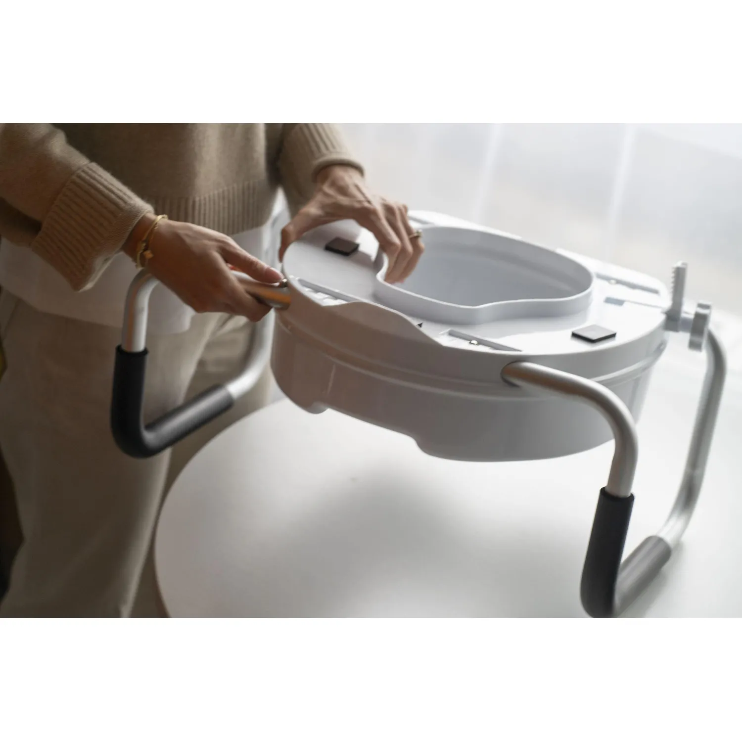 Подходит для унитаза любой формы, устанавливается и фиксируется при помощи двух креплений. Гигиенический пластик легко моется и не впитывает запахи. Эластичные резиновые уплотнители позволяют избежать механических повреждений как насадки, так и унитаза. Большие широкие поручни покрыты мягкими накладками, приятными для соприкосновения с кожей.