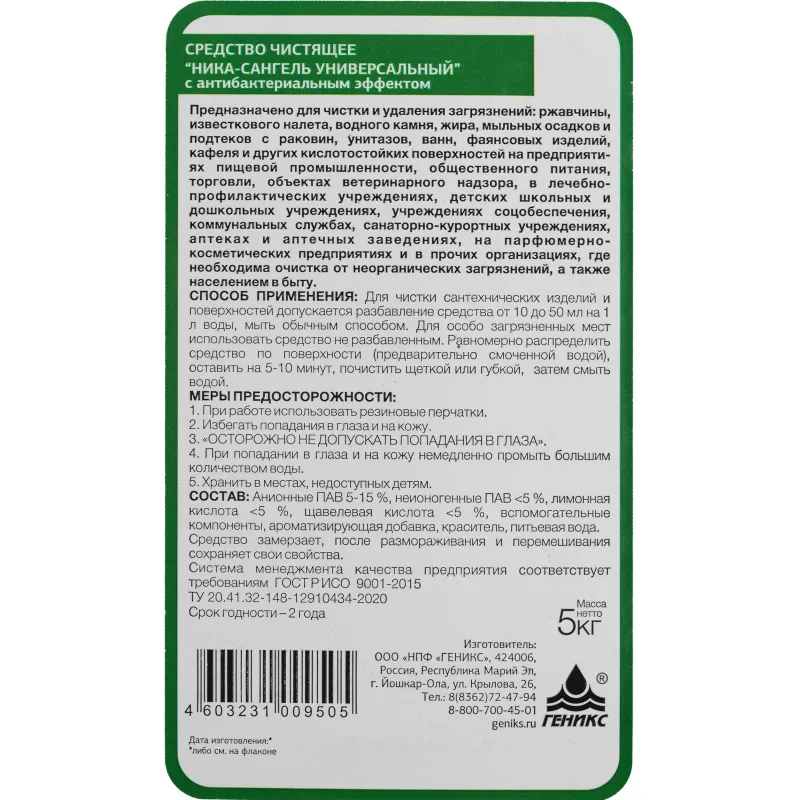 О товаре «Чистящее средство с дезинфицирующим эффектом для сантехники Ника Сангель 5 кг»