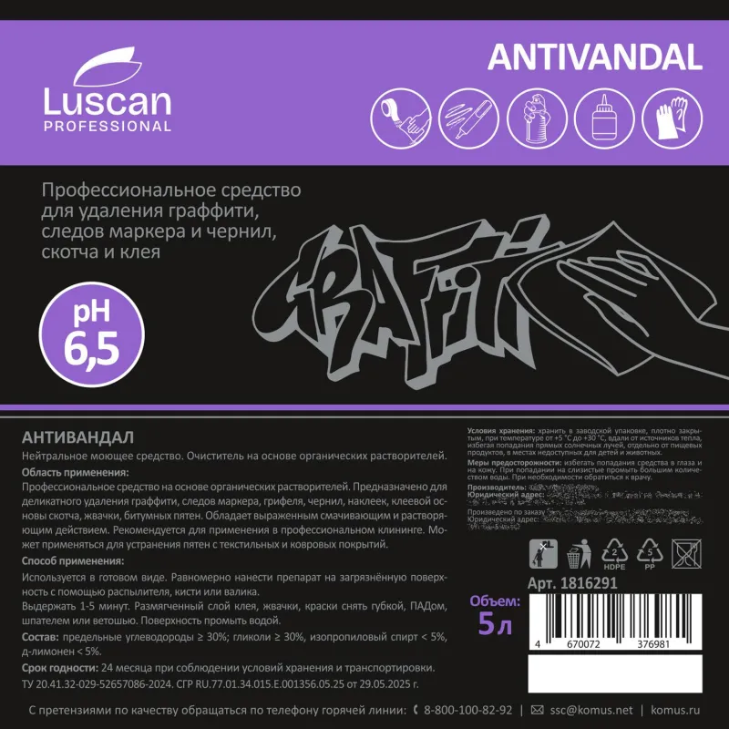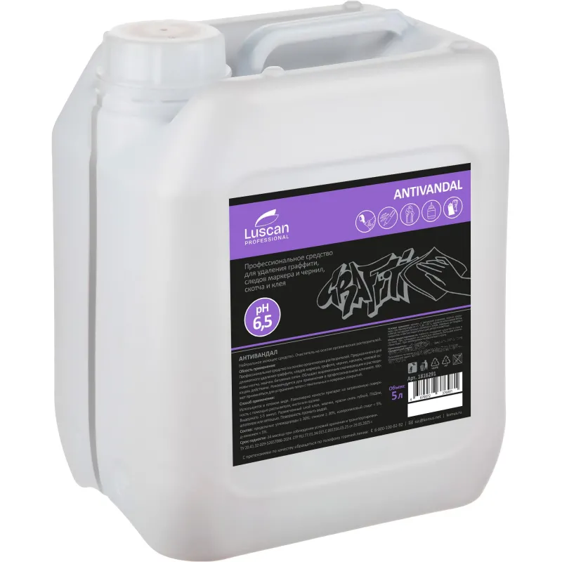 О товаре «Средство для удаления пигментных загрязнений, чернил, маркера, следов скотча Luscan Professional Antivandal 5 л»
