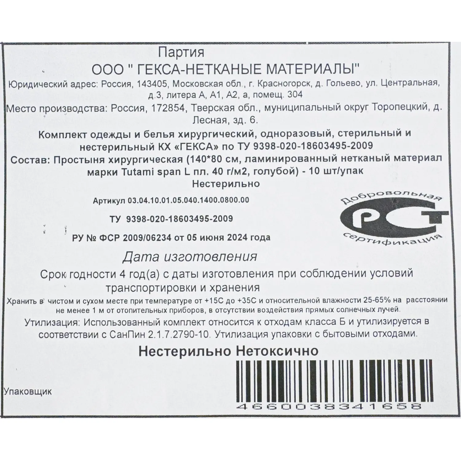 Простыня Гекса изготовлена из гипоаллергенного, безворсового, воздухопроницаемого и водоотталкивающего полипропиленового материала (спанбонд) с плотностью 40 г/кв.м. Продукт не стерильный и упакован в полиэтиленовый пакет. Спанбонд является универсальным материалом, используемым для изготовления медицинских халатов, акушерских комплектов, одноразовой медицинской одежды, масок и бахил. Несмотря на свою доступность, спанбонд по тонкости и прочности не уступает более дорогим материалам.