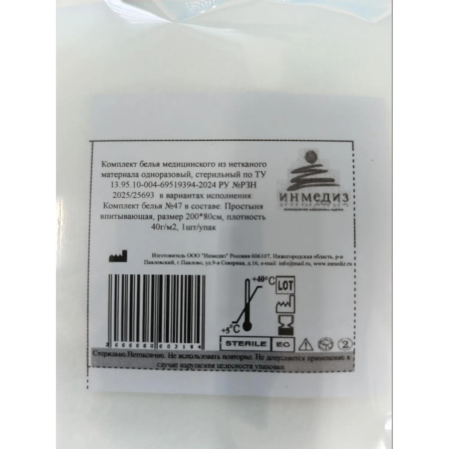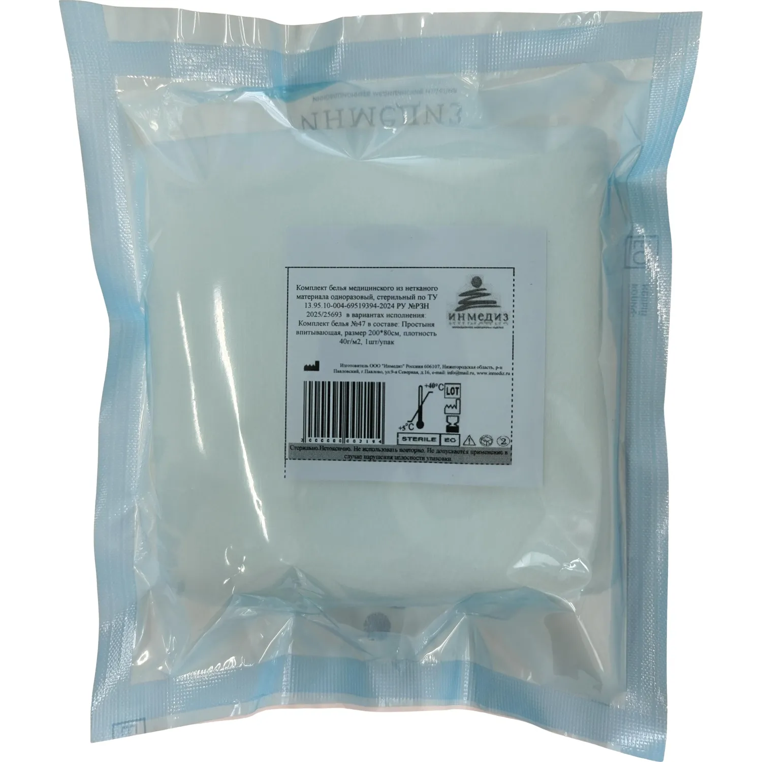 Простыня Инмедиз изготовлена из спанлейса (фибрелла), плотностью 40-42 г/кв.м, отличается высокой гигроскопичностью, прочностью, лёгкостью и мягкостью материала. Спанлейс — гипоаллергенный, безворсовый и антистатичный материал с большой впитывающей способностью. Простыня предназначена для использования в медицинских учреждениях. Продукт не имеет перфорации и обладает отличной впитываемостью. Срок годности составляет 36 месяцев.