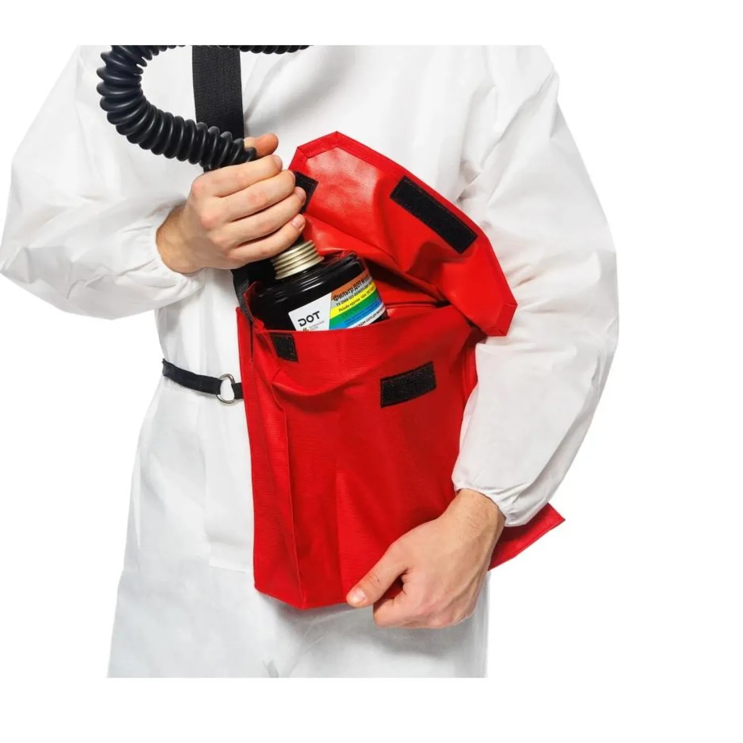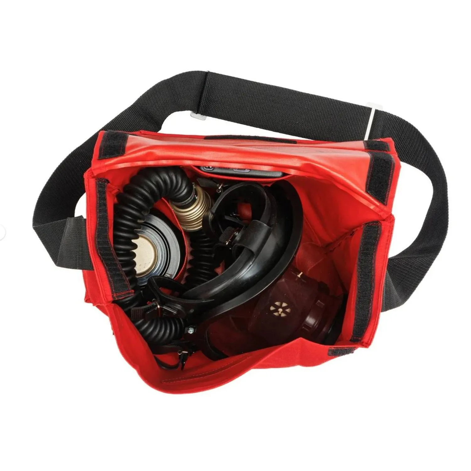 Сумка предназначена для хранения и ношения противогаза. Длина плечевого ремня регулируется с помощью пряжек. Поясная тесьма предназначена для закрепления сумки с противогазом на приемлемом для эксплуатации противогаза уровне пользователя.