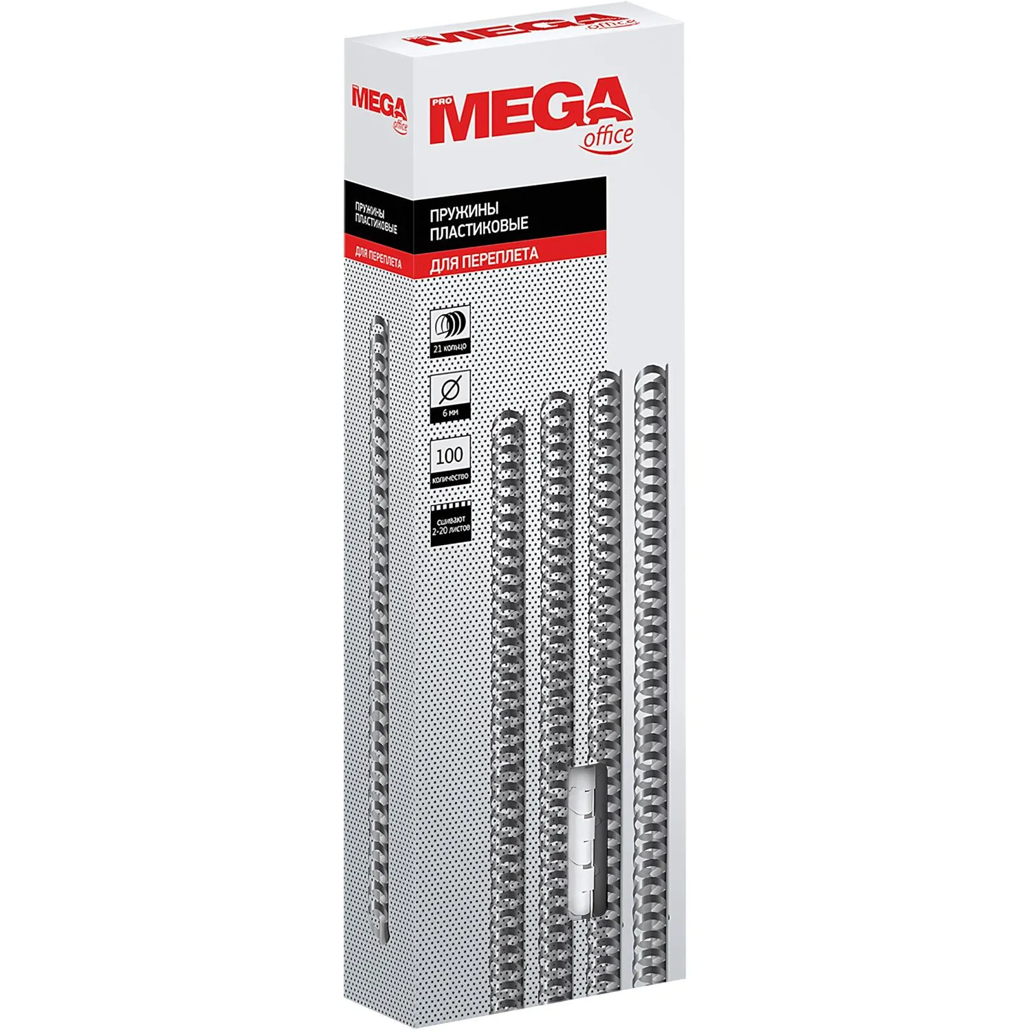 Пружины для переплета пластиковые ProMega office предназначены для сшивания до 20 листов формата А4 при помощи брошюровщика. Позволяют вынимать и добавлять листы в готовый документ. Изготовлены из прочного пластика белого цвета, состоят из 21 кольца диаметром 6 мм, шаг переплета — 3:1. Поставляются по 100 штук в упаковке.