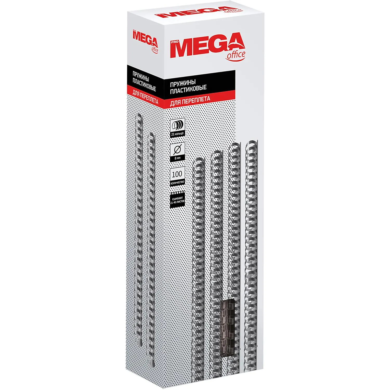 Пружины для переплета пластиковые ProMega office предназначены для сшивания до 40 листов формата А4 при помощи брошюровщика. Позволяют вынимать и добавлять листы в готовый документ. Изготовлены из прочного прозрачного пластика, состоят из 21 кольца диаметром 8 мм, шаг переплета — 3:1. Поставляются по 100 штук в упаковке.