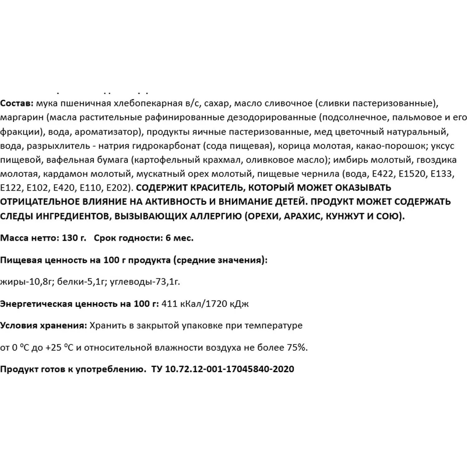 Состав: мука пшеничная хлебопекарная в/с, сахар, масло сливочное (сливки пастеризованные), маргарин (масла растительные рафинированные дезодорированные (подсолнечное, пальмовое и его фракции), вода, ароматизатор), продукты яичные пастеризованные, мёд цветочный натуральный, вода, разрыхлитель — натрия гидрокарбонат (сода пищевая), корица молотая, какао-порошок, уксус пищевой, имбирь молотый, гвоздика молотая, кардамон молотый, мускатный орех молотый, красители пищевые натуральные (бета-каротин, бетаин, экстракт спирулины синей, экстракт сафлора, уголь растительный, колер карамельный), пищевые чернила (вода, Е422, Е1520, Е133, Е122, Е102, Е420, Е110, Е202).