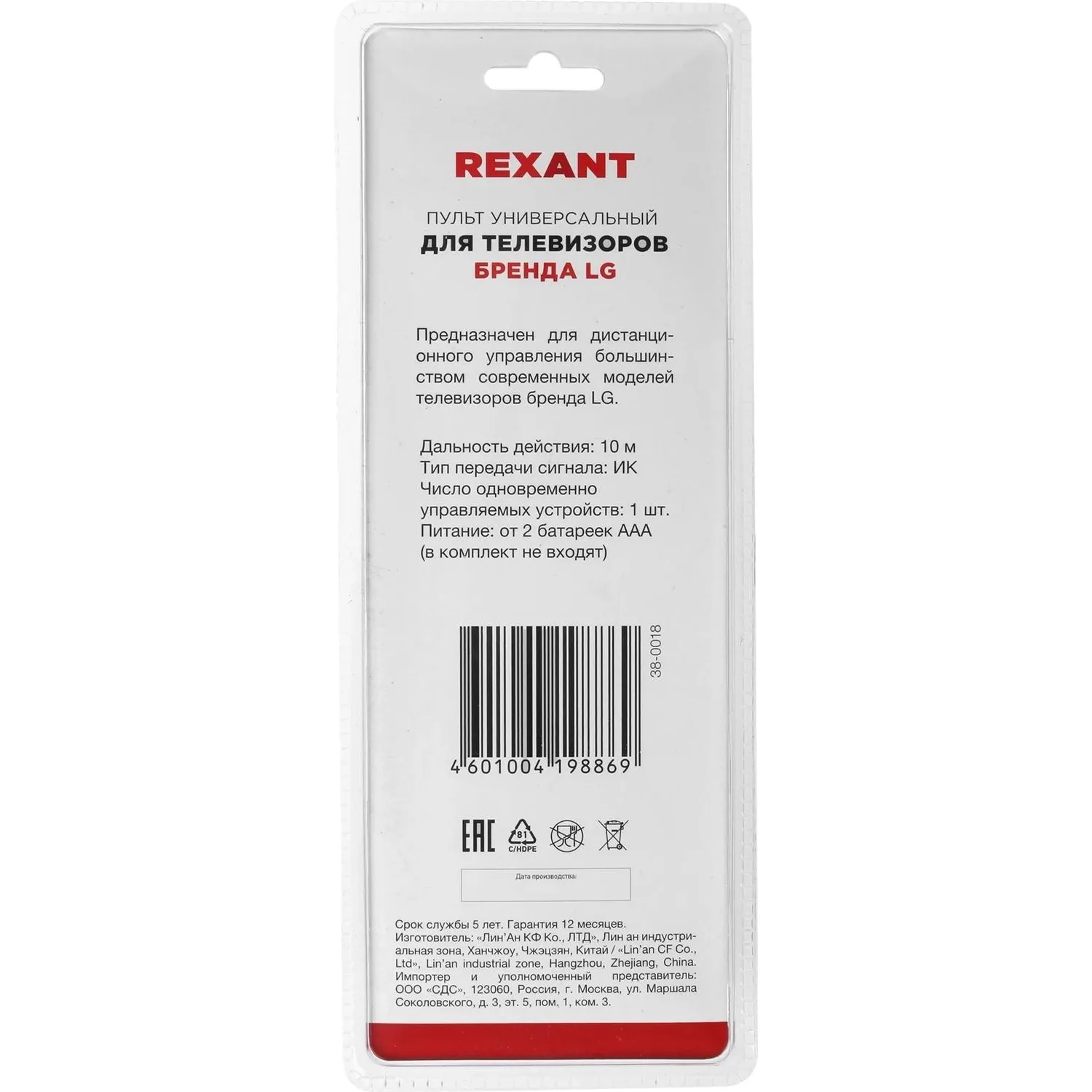 О товаре «Пульт ДУ REXANT универсальный для телевизора LG (38-0018)»