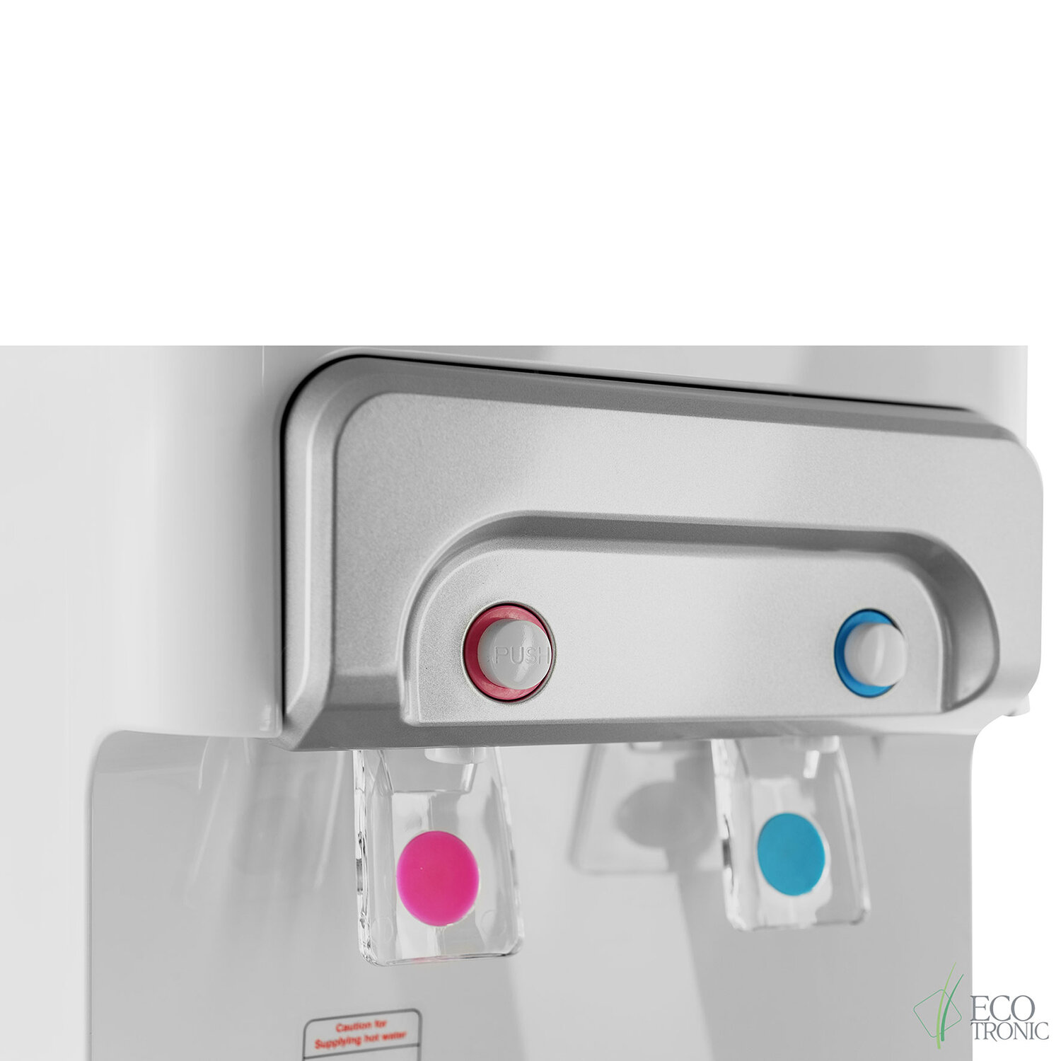 Аппарат оснащен двумя клавишами подачи воды (горячая и холодная). Кран горячей воды с защита от детей (кнопка на передней лицевой вставке). Кран комнатной температуры отсутствует. Вода из кранов подается нажатием кружкой.