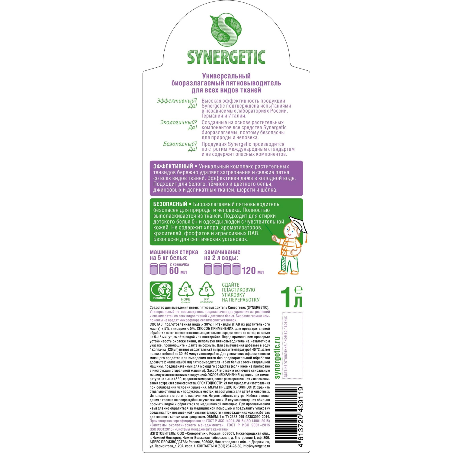 О товаре «Пятновыводитель Synergetic для белого и цветного, для тёмных и чёрных тканей жидкость 1 л»