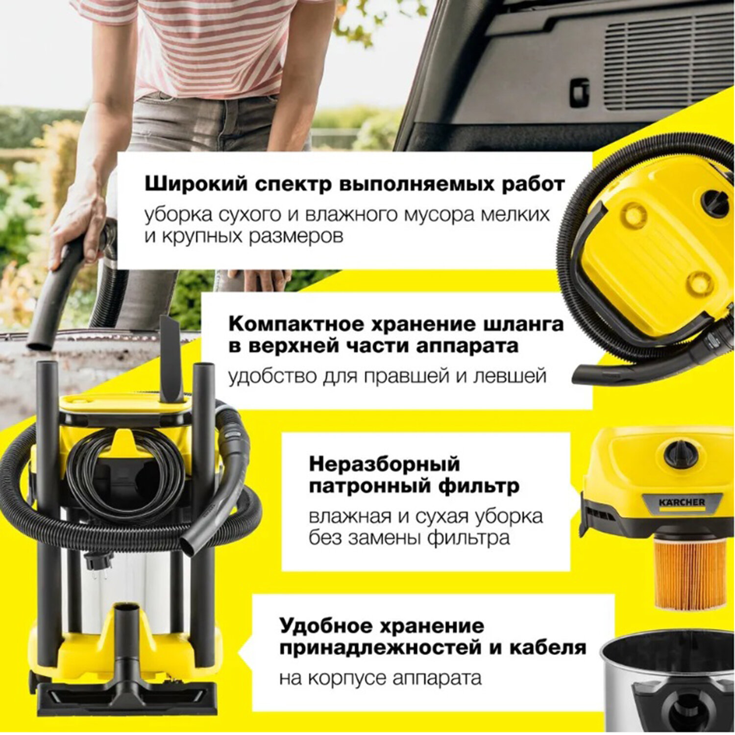 KARCHER WD 3 S V-17/4/20 — надежное и экономичное решение для сухой уборки и сбора небольшого количества жидкости. Чистит поверхности на входе в дом, в мастерской или в салоне автомобиля.