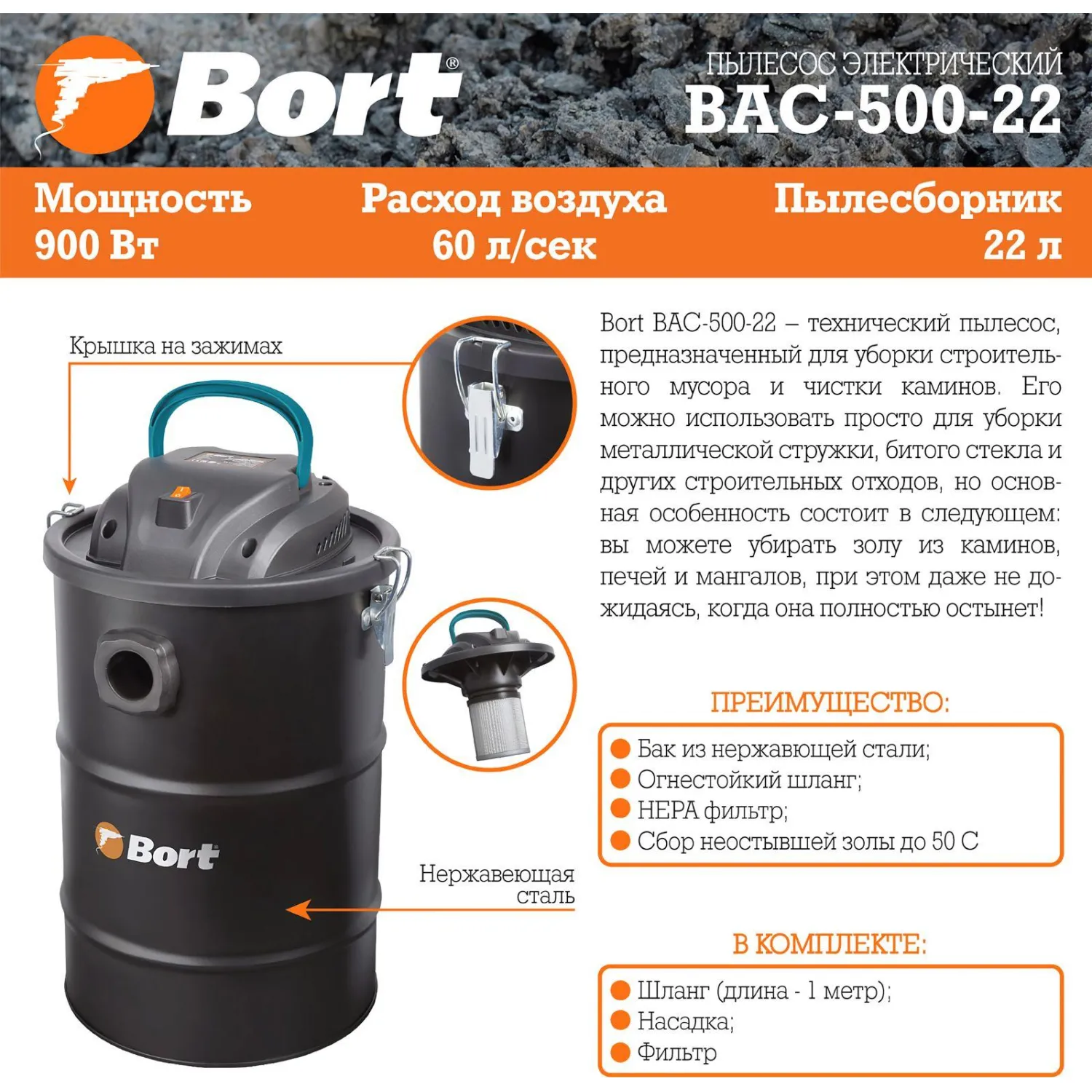 Bort BAC-500-22 — технический пылесос, предназначенный для уборки строительного мусора и чистки каминов. Его можно использовать просто для уборки металлической стружки, битого стекла и других строительных отходов, но основная особенность состоит в следующем: вы можете убирать золу из каминов, печей и мангалов, при этом даже не дожидаясь, когда она полностью остынет! Рабочая температура пылесоса — до 50 градусов. Конструкция простая, так что вы можете легко разобрать его и очистить. Он имеет 2 ступени очистки: железная сетка отсеивает крупный мусор (такой как металлическая стружка), а сеткой воздух проходит через фильтр тонкой очистки. С таким помощником вам больше не нужно будет собирать золу и мусор совком и щеткой.