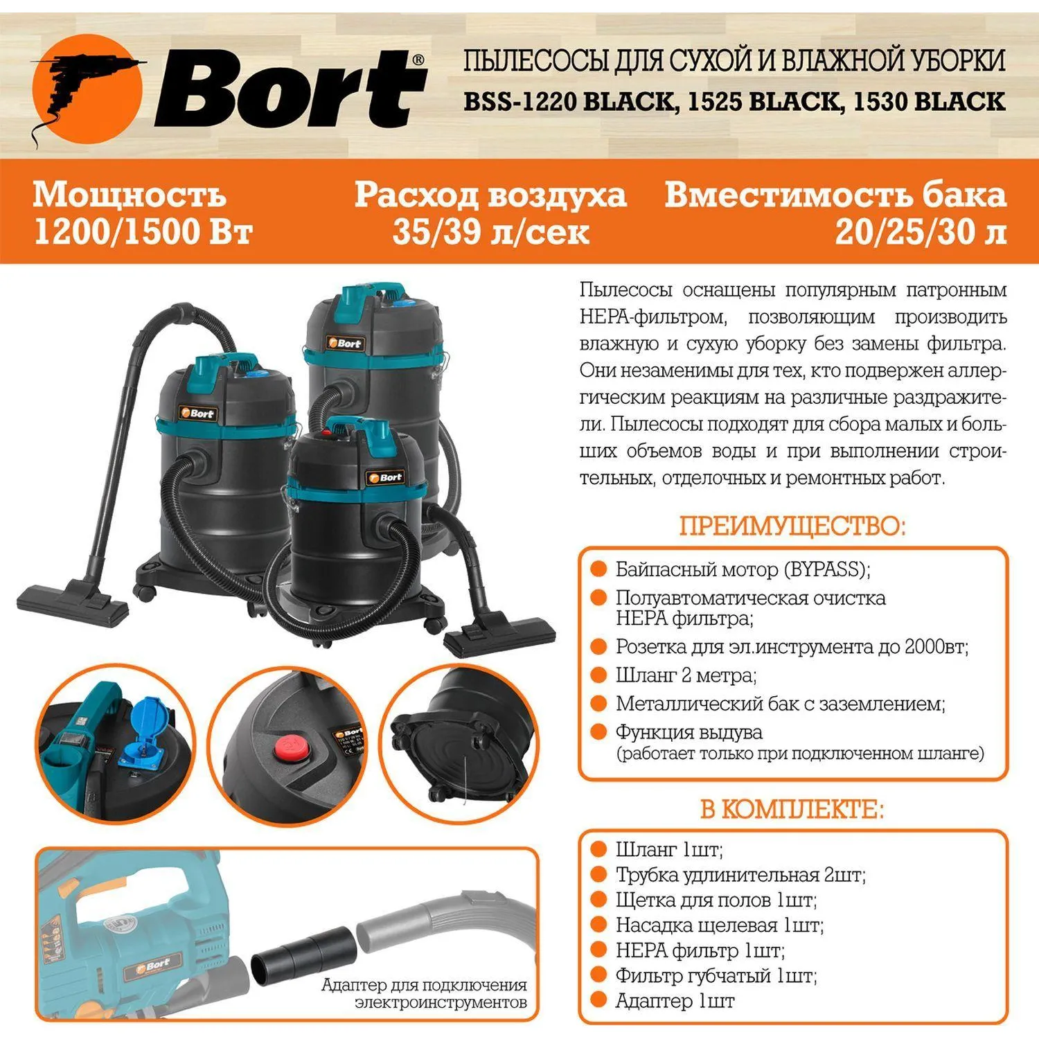 О товаре «Пылесос строительный BORT BSS-1220 BLACK, 20 л (93412598)»
