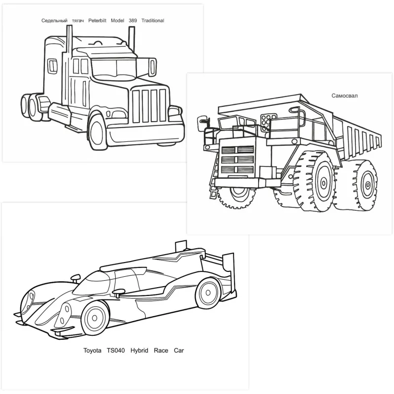 Набор раскрасок «Автомобили» рассчитан на детей от 4 лет. Каждая раскраска выполнена в мягкой обложке и содержит 8 страниц с изображениями транспорта и техники.