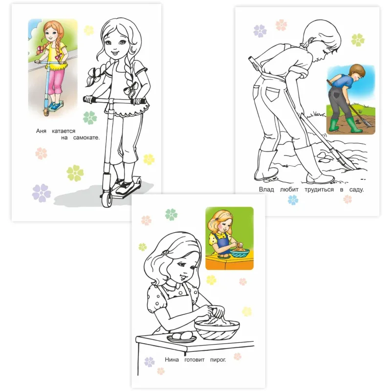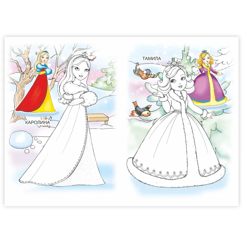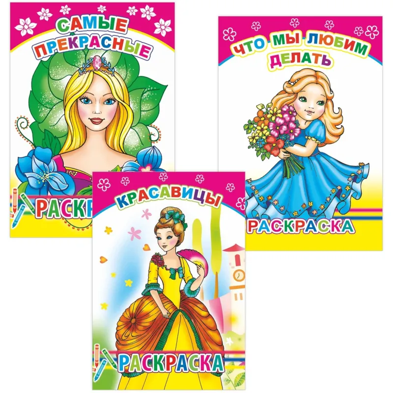 Набор раскрасок создан для девочек и включает тематические изображения с образцами для раскрашивания. Каждая раскраска выполнена в мягкой обложке и содержит 12 страниц. Формат А5 делает её удобной для занятий дома и в дороге.