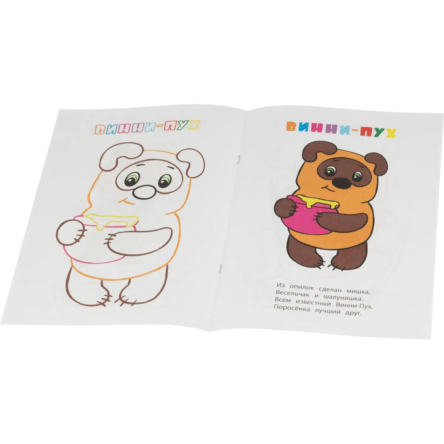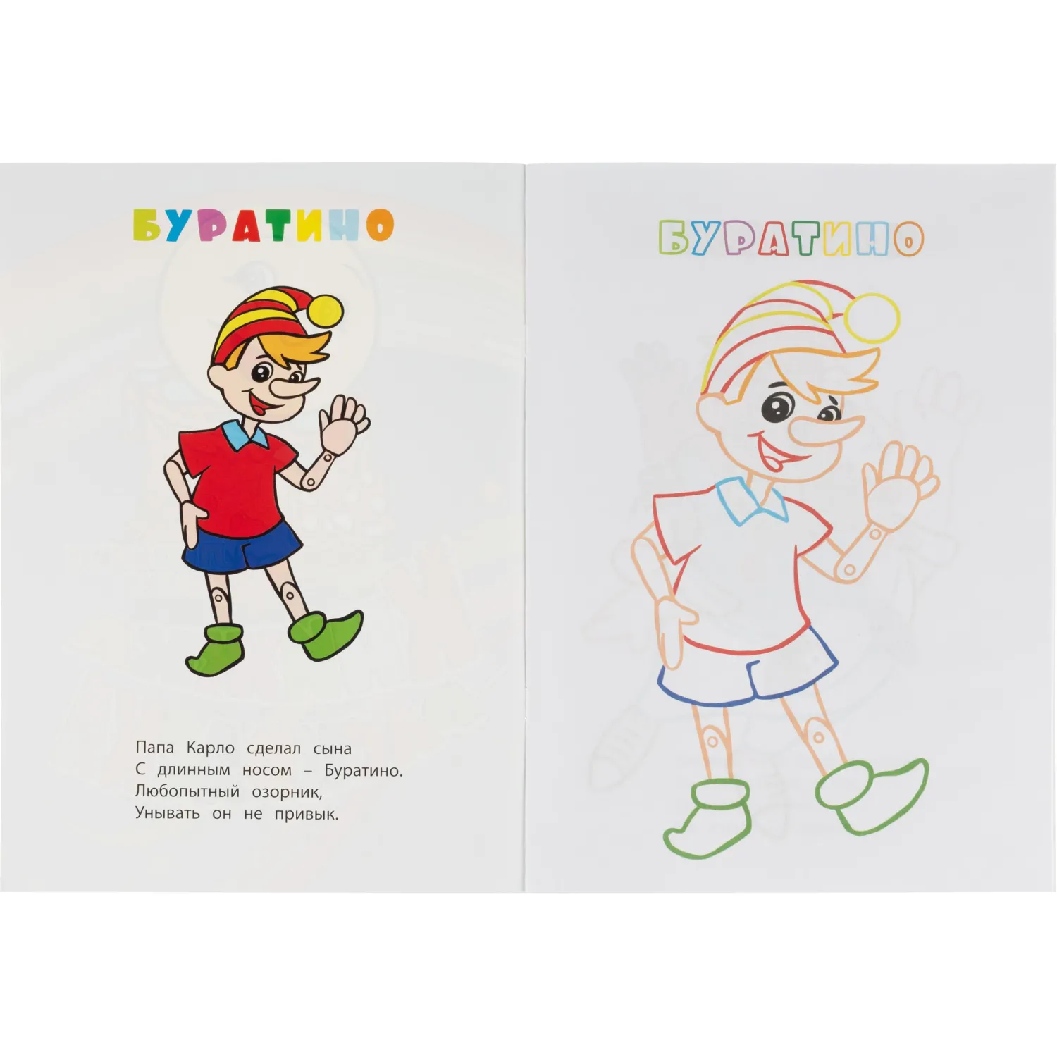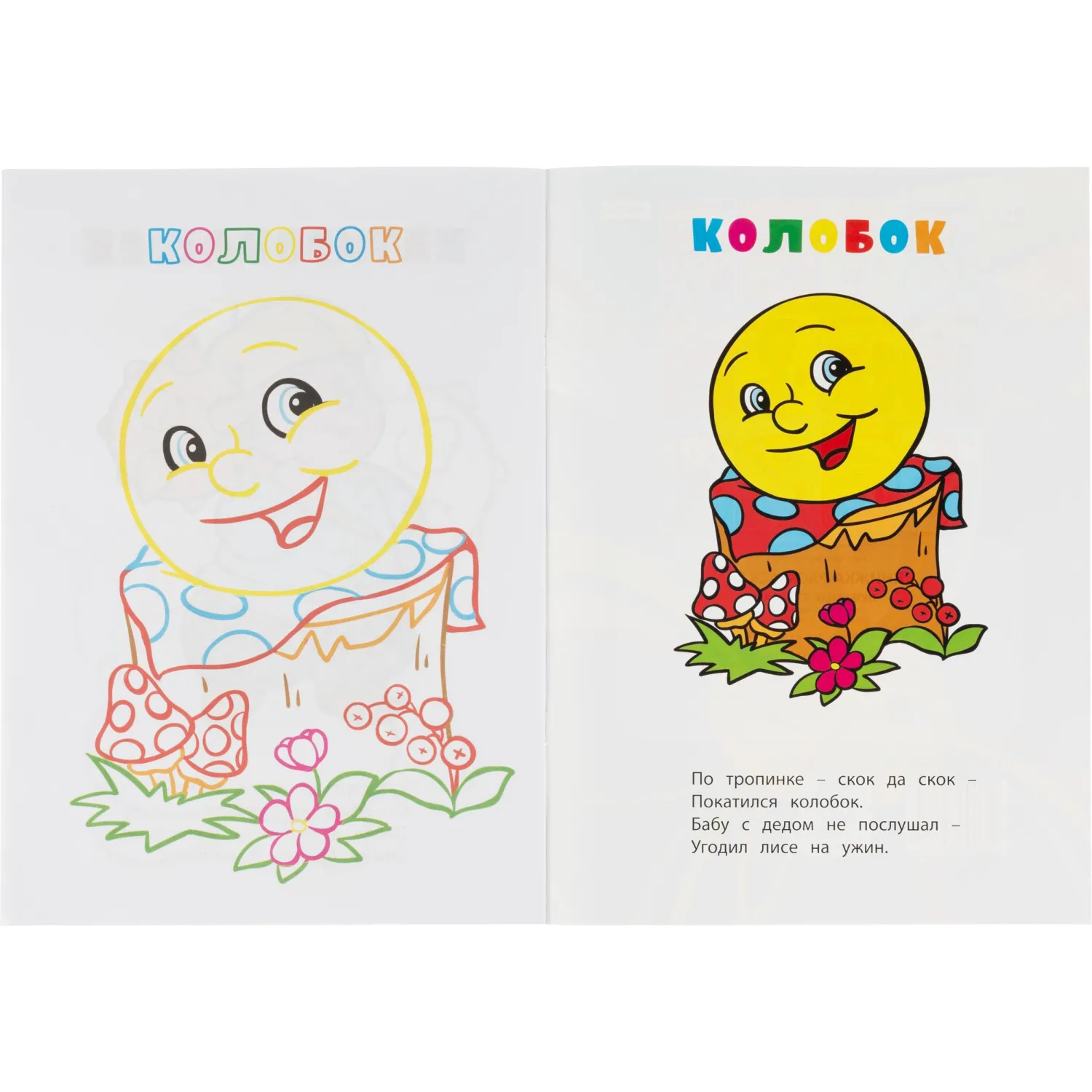 Раскраска формата А4 содержит 12 страниц с иллюстрациями по мотивам сказок. Простые контуры и картинки-образцы помогают ребёнку быстрее освоить основы раскрашивания, а детские стишки делают процесс познавательным и весёлым. Занятие с такой книгой развивает фантазию, образное мышление и мелкую моторику, а также помогает ребёнку приобретать первые речевые навыки. Издание напечатано на офсетной бумаге плотностью 80 г/кв.м и имеет мягкую обложку. Для работы подходят карандаши и цветные ручки. Раскраска предназначена для детей с раннего возраста (0+). Страна производства — Россия.