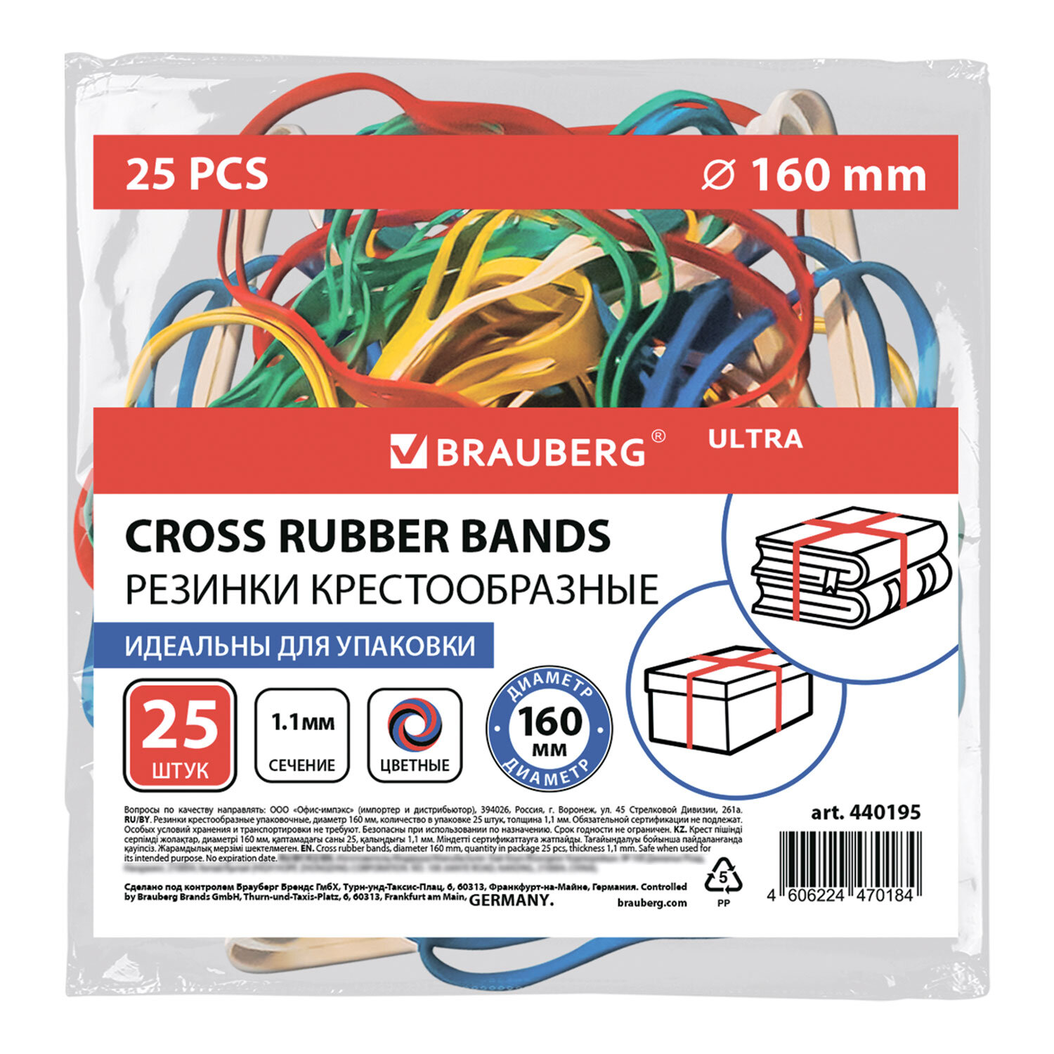 Резинки КРЕСТООБРАЗНЫЕ упаковочные, диаметр 160 мм, 25 шт., цветные, каучук, BRAUBERG, 440195