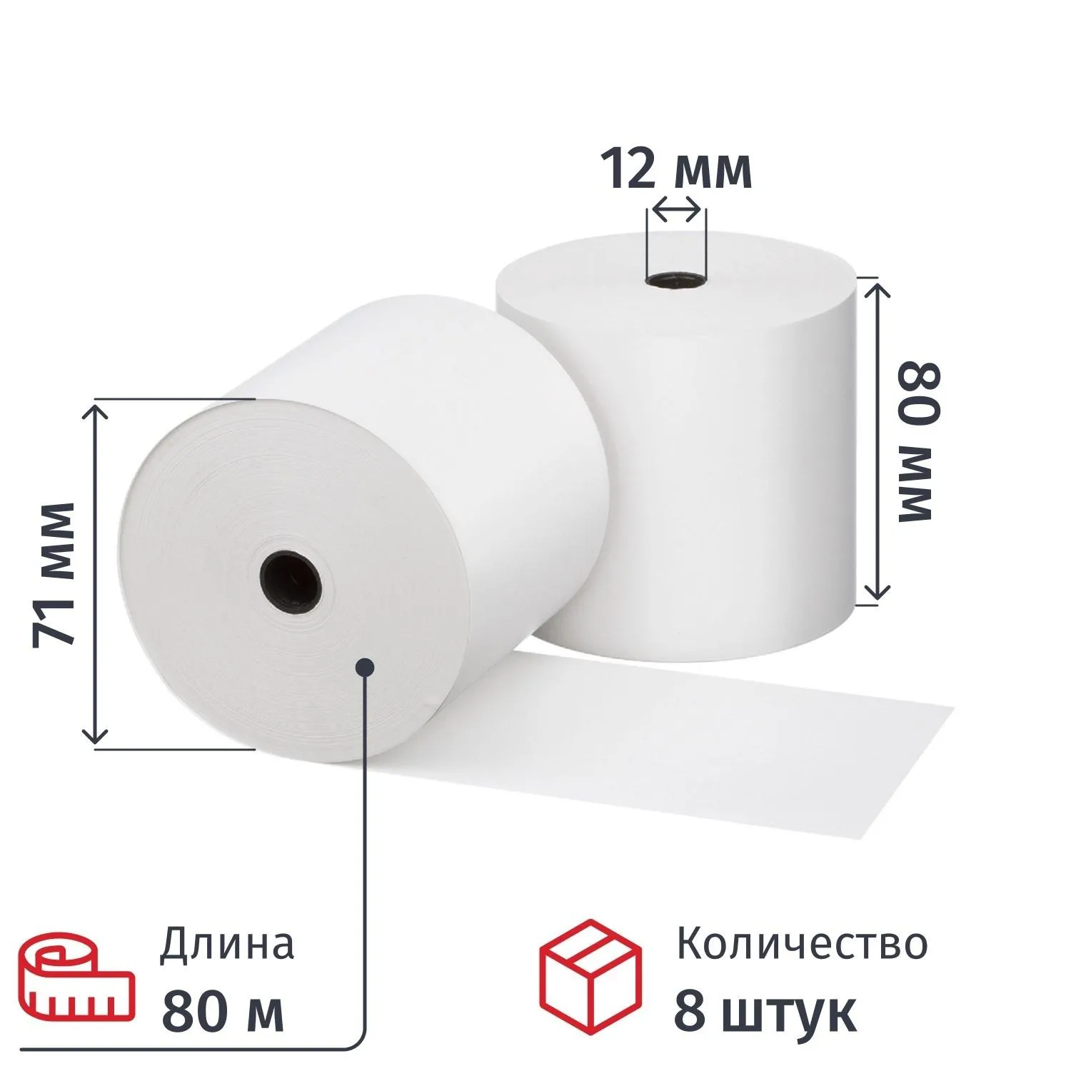 Чековая лента изготовлена из термобумаги. Бумажное полотно с наружным термослоем имеет ширину 80 мм и общую длину 80 м. Диаметр намотки — 71 мм, диаметр втулки — 12 мм. Поставляются в термоусадочной плёнке и гофрокоробах. Ролики для термопечати используются в кассовых аппаратах и калькуляторах со встроенным или внешним термопринтером. Цвет печати — чёрный.