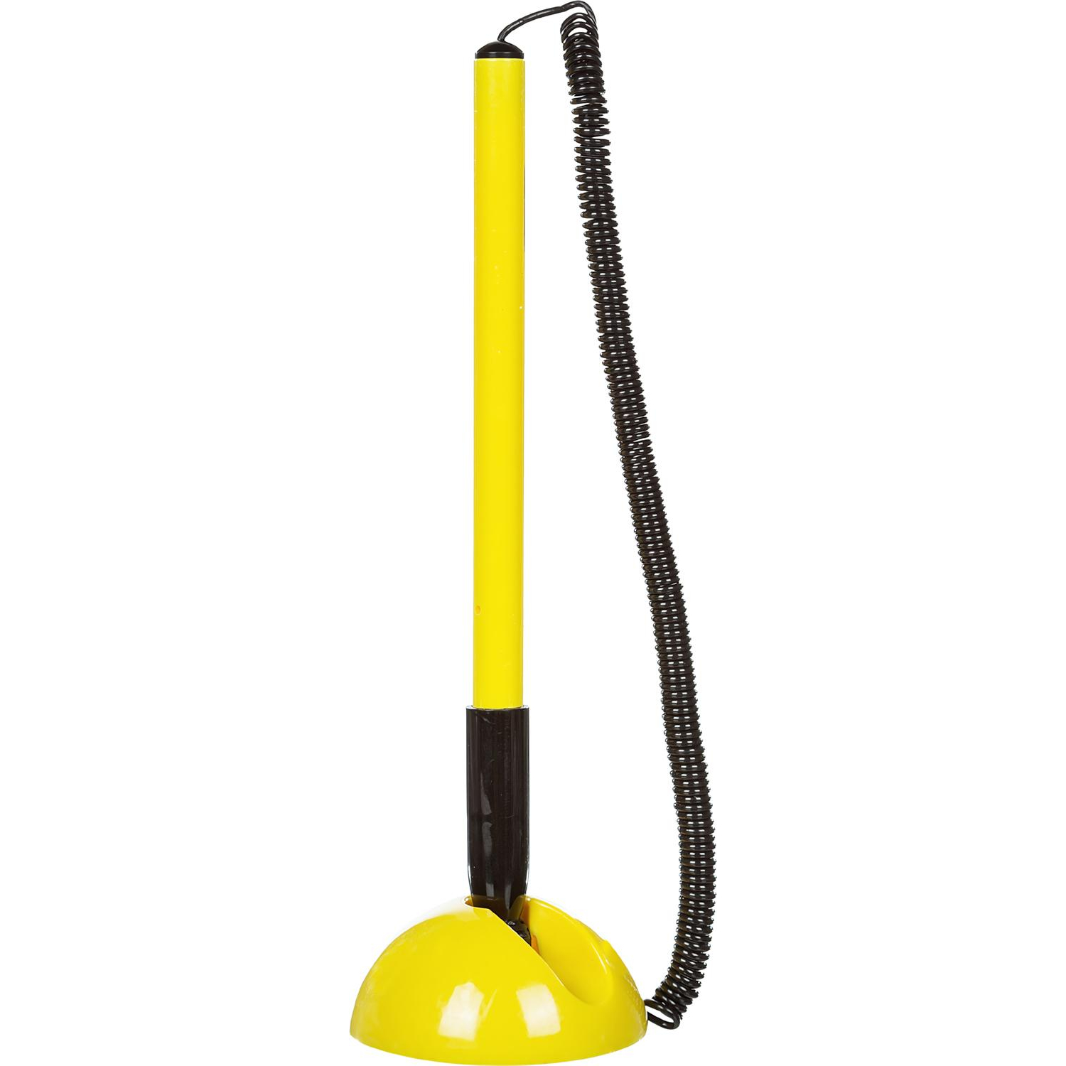 Шариковая ручка на подставке Attache Simple с синим цветом чернил. Модель выполнена в желтом корпусе с деталями черного цвета. Специально разработана для офисов и различных учреждений. С одной стороны она крепится к пластиковой пружине, а с другой — к специальной подставке с липким основанием для установки на столах или тумбах. Толщина линии стержня составляет 0.5 мм. Возможна замена стержня. Длина стержня — 134.4 мм. Для фиксации ручки на поверхности удалите слой защитной пленки с клейкого основания. Расходные материалы для данной ручки не представлены в ассортименте производителя и в ассортименте компании Комус.
