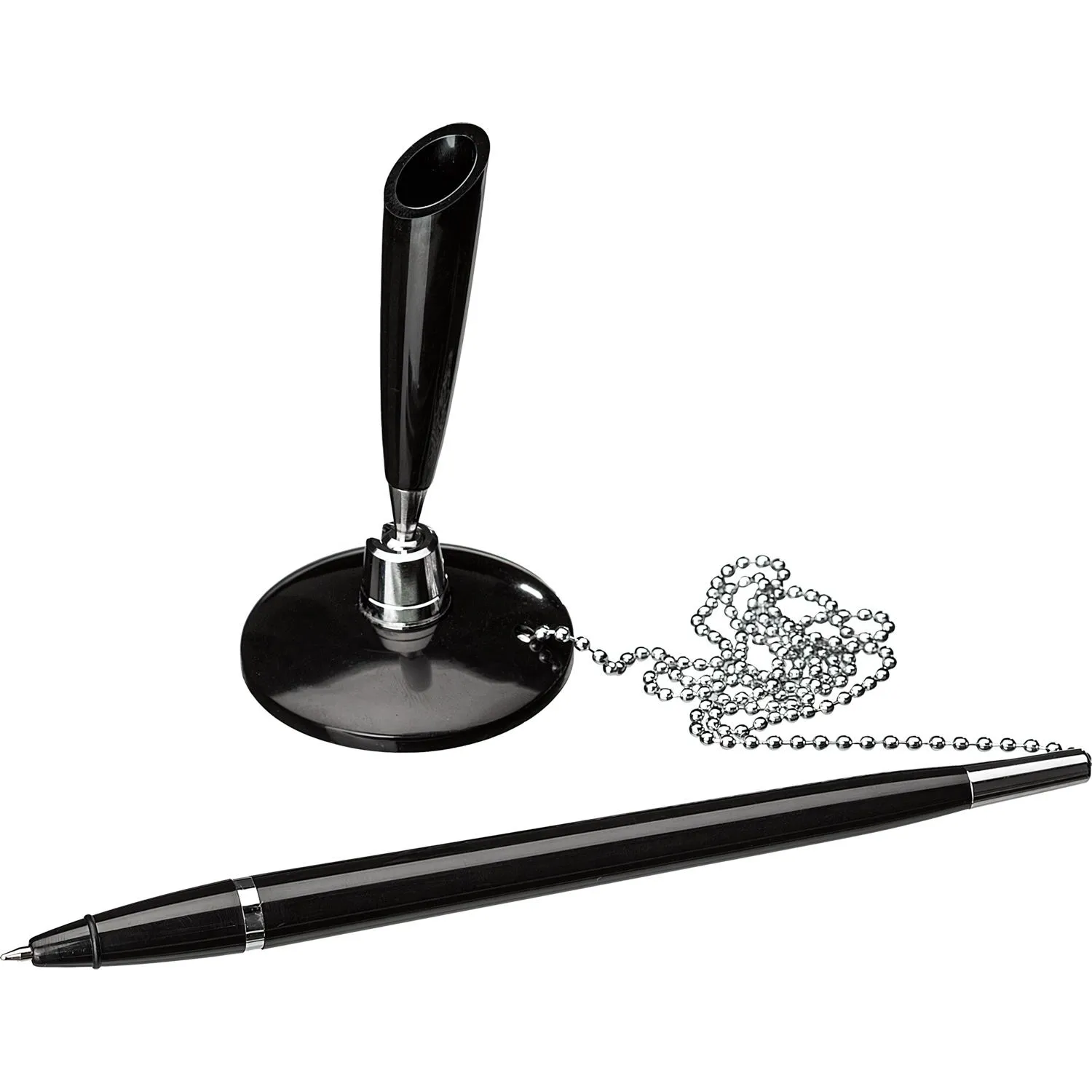 Шариковая ручка Beifa в подставке с синим цветом чернил. Модель в черном корпусе специально разработана для офисов и различных учреждений: с одной стороны крепится к 58-сантиметровой металлической цепочке, а с другой — к специальной подставке с липким основанием для установки на столах или тумбах. Толщина линии письма составляет 0.5 мм. Возможна замена стержня. Для фиксации ручки на поверхности удалите слой защитной пленки с клейкого основания. Дополнительные стержни для ручки вы сможете найти во вкладке «Расходные материалы».