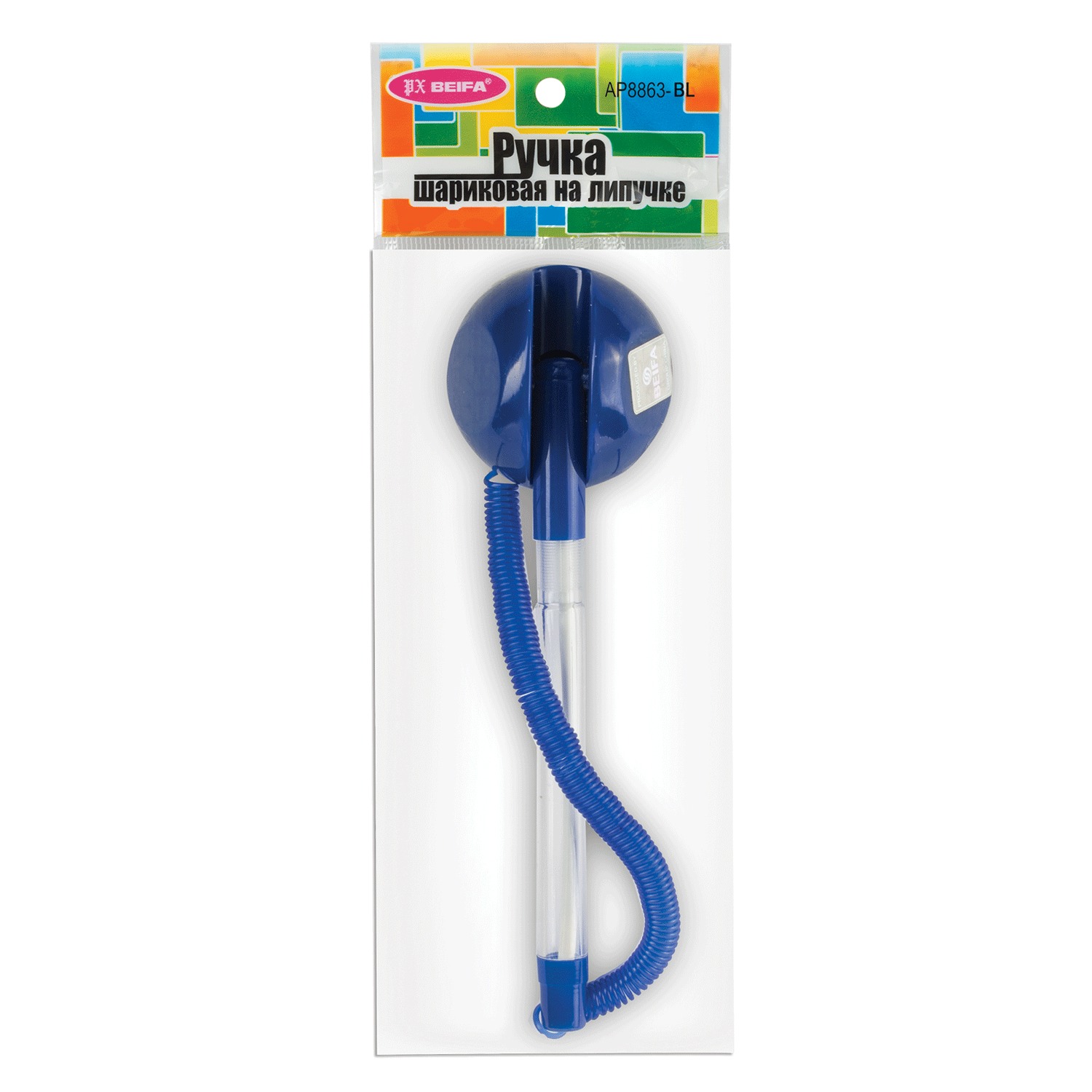 Шариковая ручка Beifa в подставке с синим цветом чернил. Модель представлена в корпусе прозрачного цвета с деталями синего цвета, выполненном из пластика. Изделие прикреплено к подставке с помощью резинового шнура-пружины. Длина пружины ручки в ненатянутом состоянии 14 см, в натянутом — 133 см. Благодаря липкому слою на основании подставка может быть жестко зафиксирована практически на любой ровной поверхности. Диаметр подставки — 45 мм, высота — 27 мм. При письме стержень, оснащенный шариком, оставляет линию, толщина которой составляет 0,5 мм. Возможна замена стержня. Дополнительные стержни для ручки вы сможете найти во вкладке «Расходные материалы». Удобна для использования в офисах и различных учреждениях. Для фиксации ручки на поверхности удалите слой защитной пленки с клейкого основания.