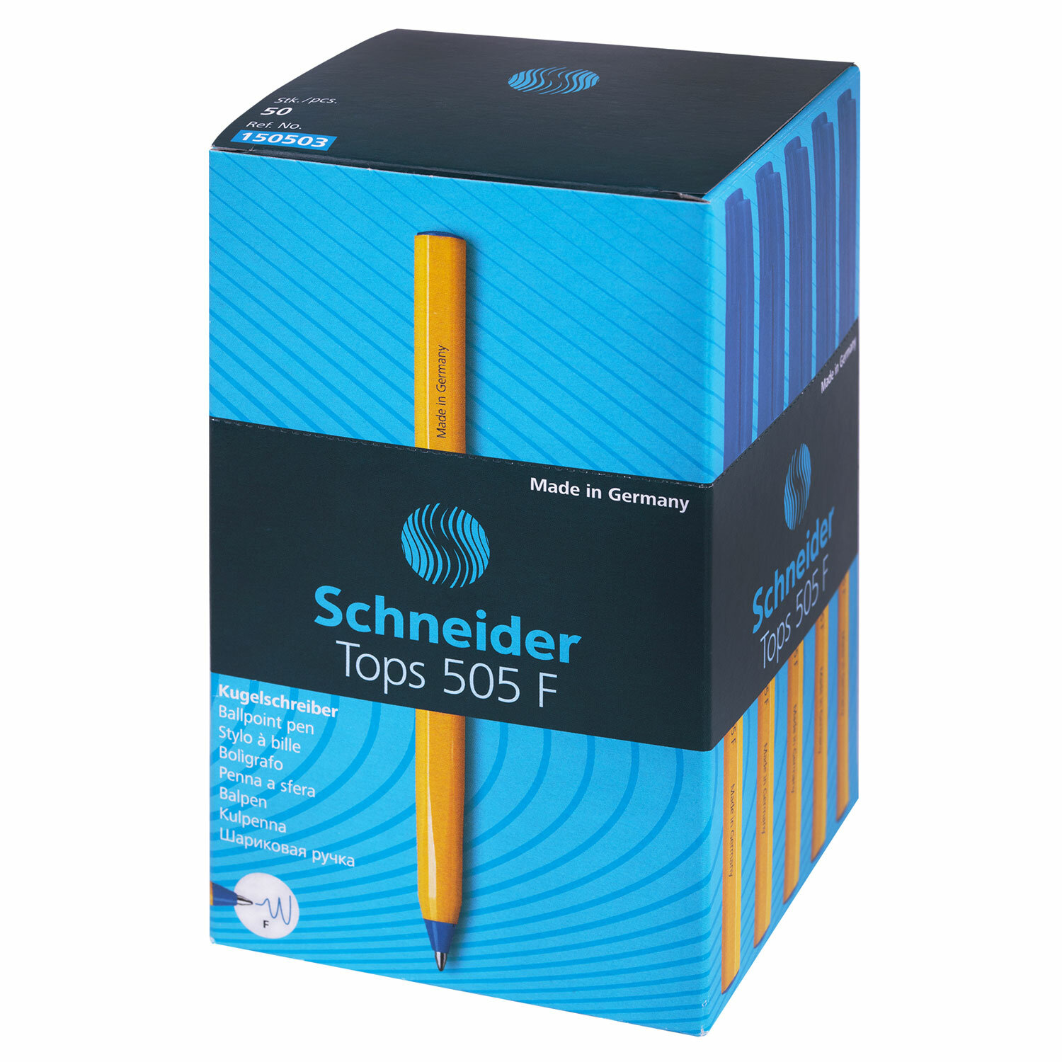 Набор шариковых ручек Schneider Tops 505 F в шестигранном оранжевом корпусе с синим колпачком под цвет чернил. Диаметр пишущего узла ручки составляет 0,8 мм, толщина линии письма – 0,4 мм. Длина линии письма - 4000 м. В упаковке 50 ручек. Письменные принадлежности Schneider разрабатываются и производятся только в Германии.