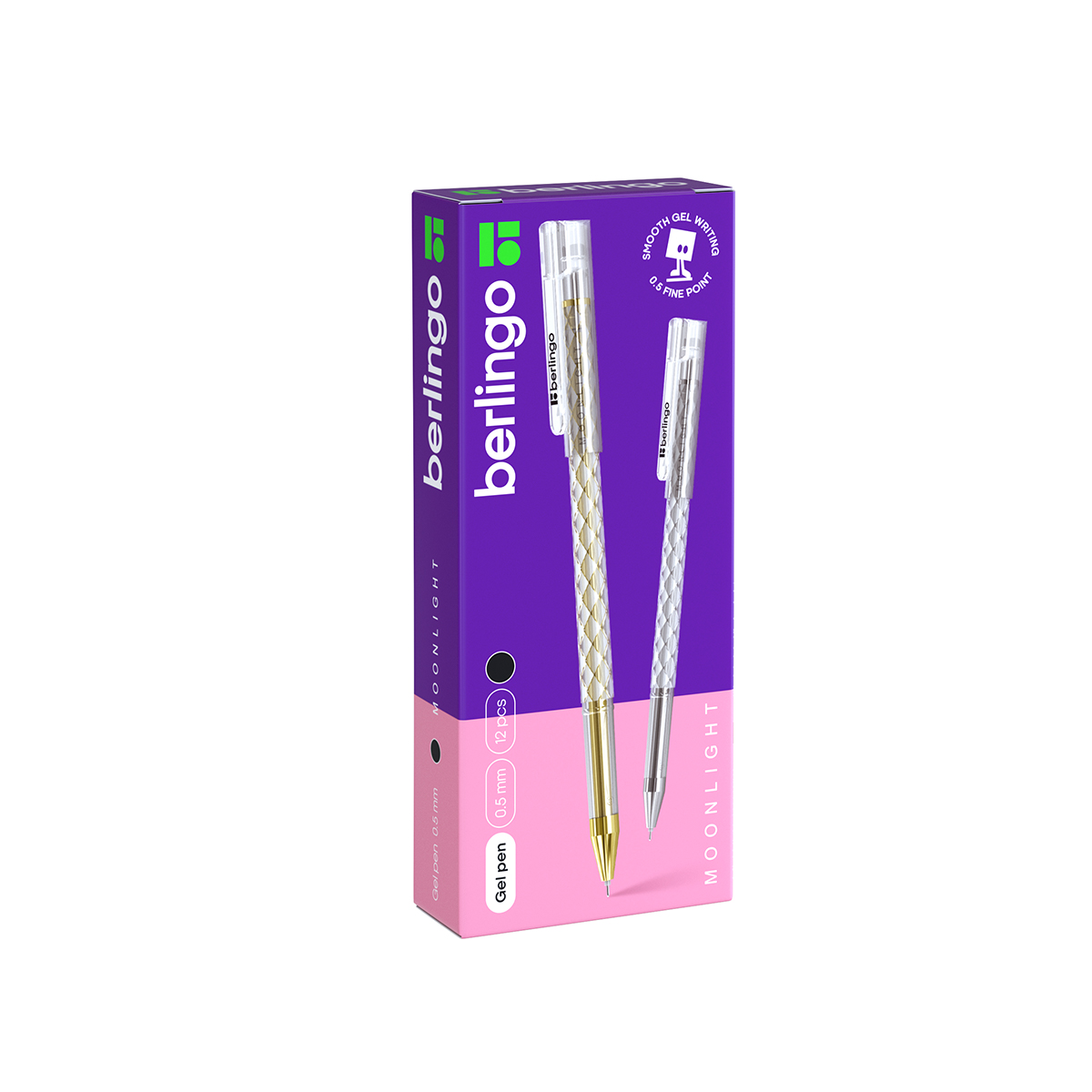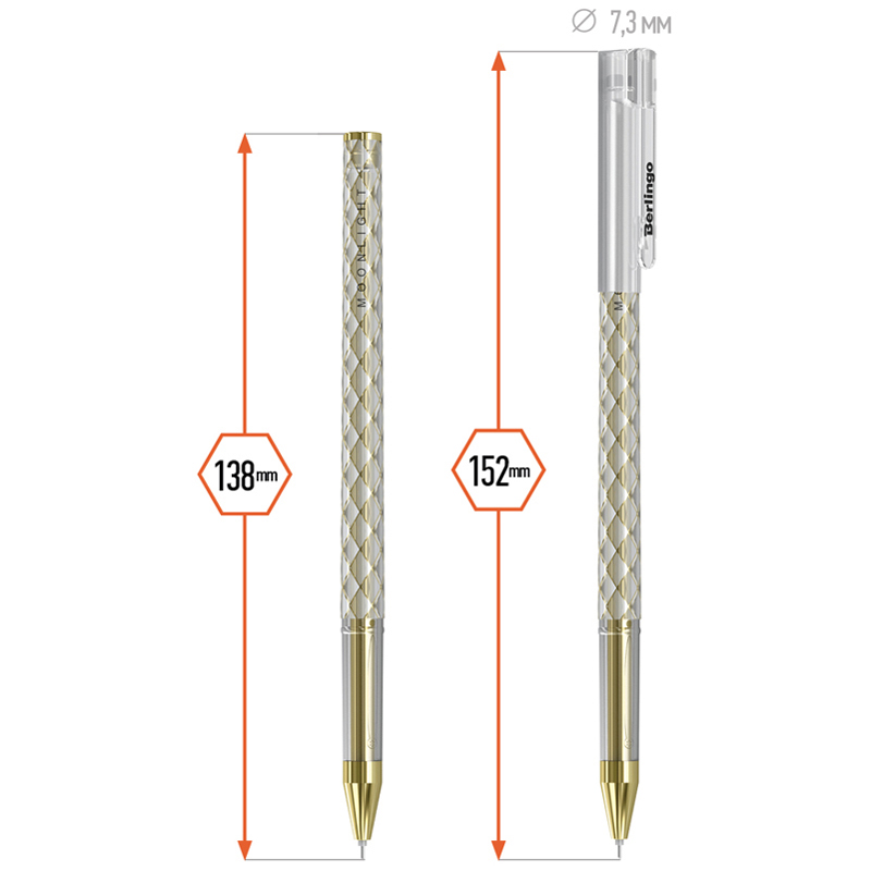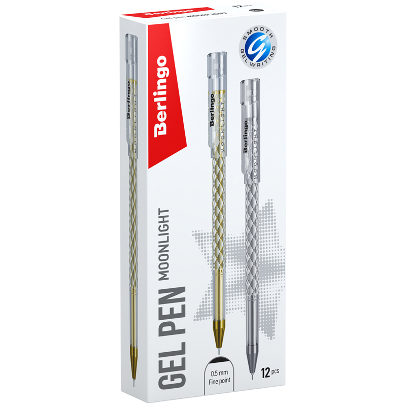Гелевая ручка Berlingo "Moonlight" выполнена в изящном круглом корпусе с оригинальной отделкой золотой и серебристой фольгой. Стержень украшен в цвет отделки корпуса, что в комплексе дает уникальное дизайнерское решение. Поставляется в коробочках по 12 штук: 6 золотых и 6 серебряных. Диаметр пишущего узла составляет 0,5 мм, благодаря чему получается тонкая, аккуратная линия.