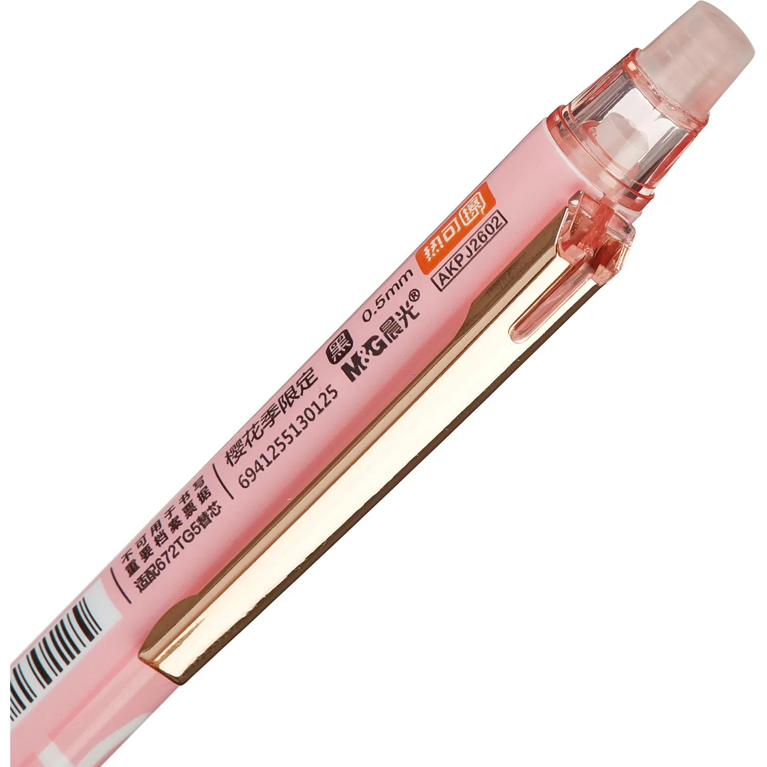 Ручка гелевая автоматическая M&G Sakura со стираемыми чернилами синего цвета обладает стандартным наконечником, обеспечивающим толщину линии письма 0.35 мм. Термочувствительные чернила становятся невидимыми при нагревании. Для удаления надписи необходимо потереть ее специальным ластиком, встроенным в основание тыльной части ручки. При письме и стирании ручка не повреждает структуру бумаги, делая исправления незаметными. Ручка не рекомендована для использования в деловых документах.