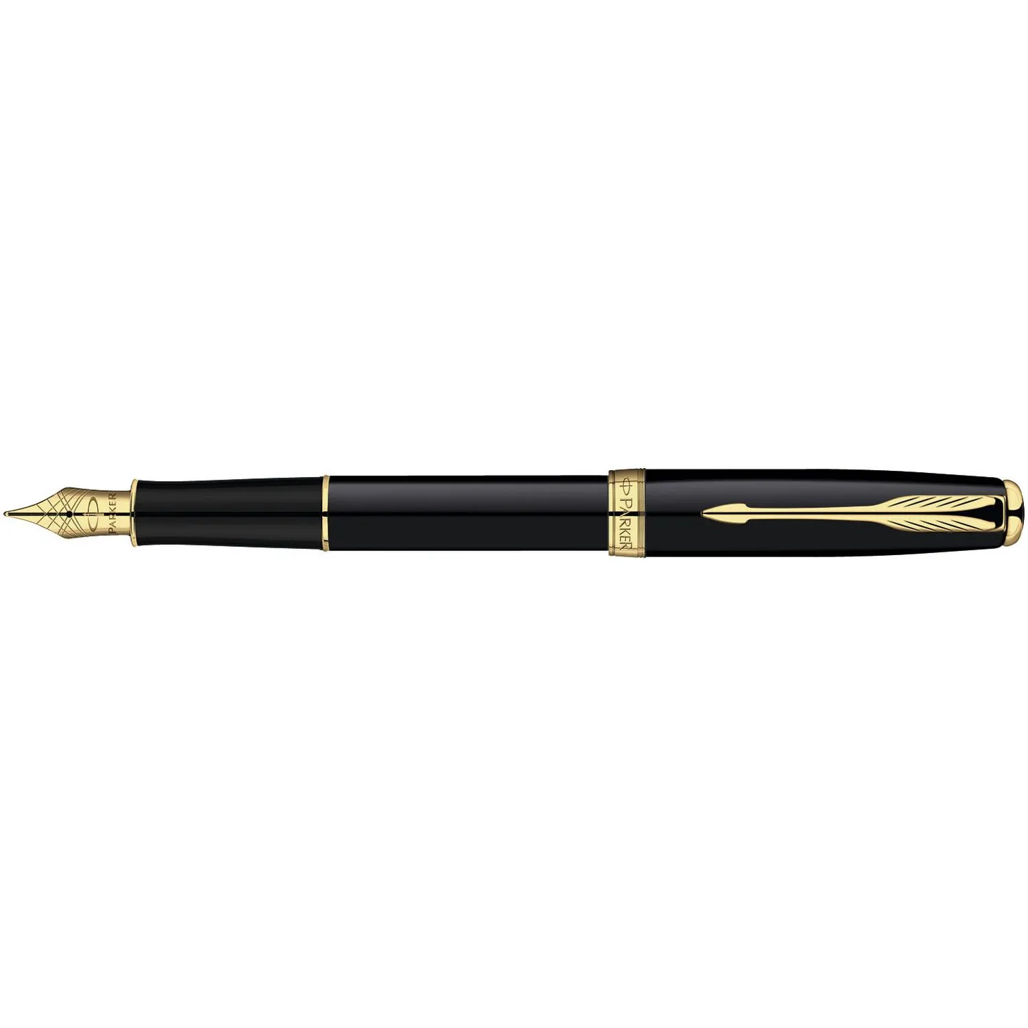 Ручка перьевая PARKER sonnet. Корпус сделан из латуни черного цвета. Декоративные детали дизайна покрыты позолотой 23К. Перо — сталь с позолотой 23К, толщина линии письма F. В комплект входит: два черных картриджа и конвертер для заправки чернилами из флакона. Ручка перьевая поставляется в индивидуальном футляре. Дополнительные чернильные картриджи и чернила во флаконе вы можете найти во вкладке ’Расходные материалы’. SONNET — одна из самых элегантных коллекций, основанная на классическом стиле и умеренных формах. Стальной корпус из нержавеющей стали сбалансированного веса и оптимальной формы. Позолоченные детали отделки корпуса.