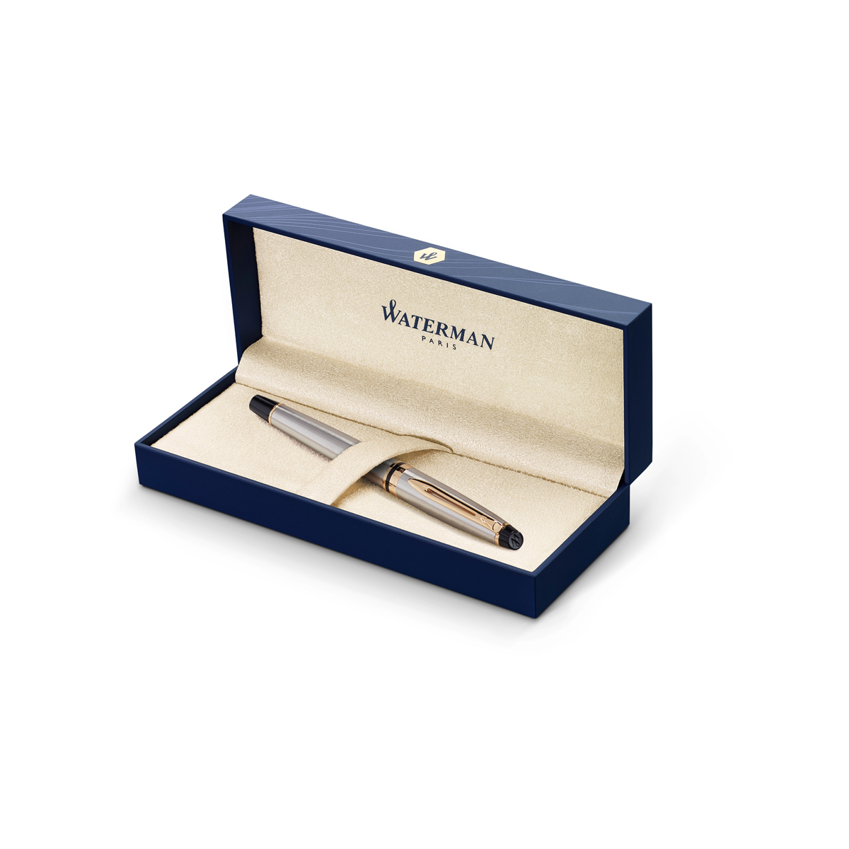 Перьевая ручка Waterman коллекции Expert в подарочном футляре. Корпус и колпачок выполнены из нержавеющей полированной стали, декоративные детали покрыты 23-каратной позолотой. Толщина линии пера — F. Ручка комплектуется сменным картриджем с чернилами синего цвета.