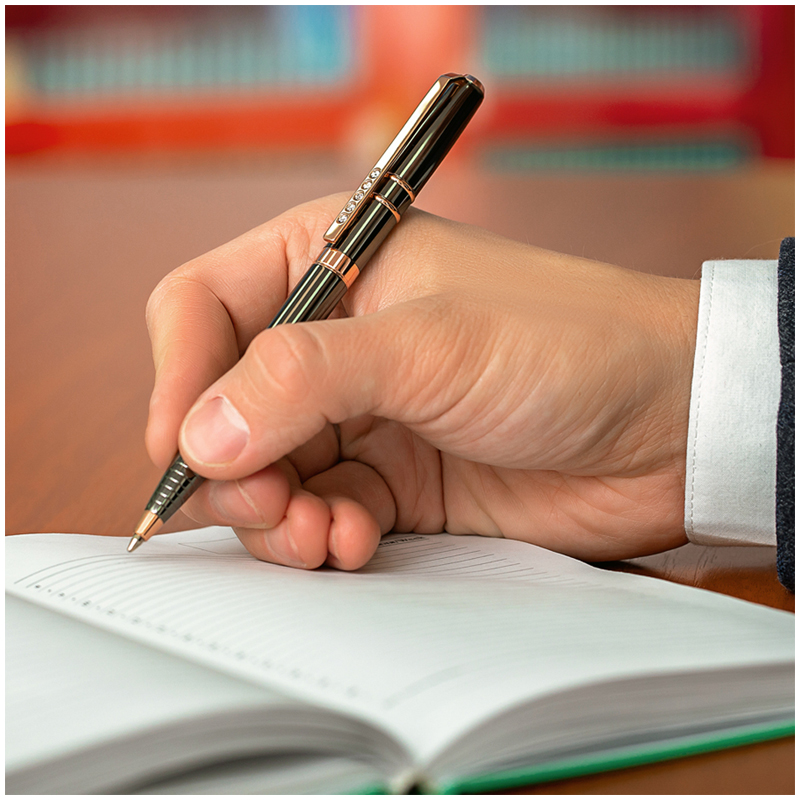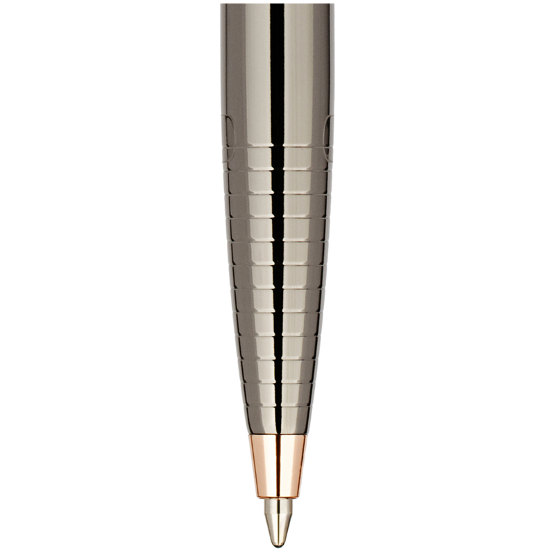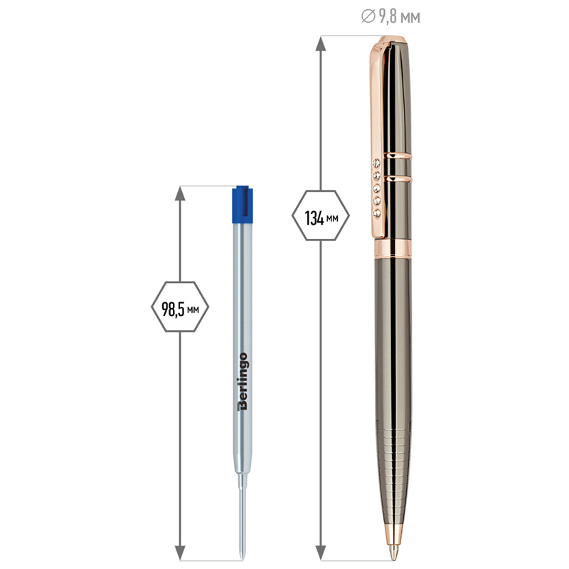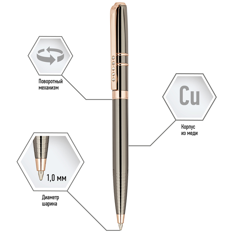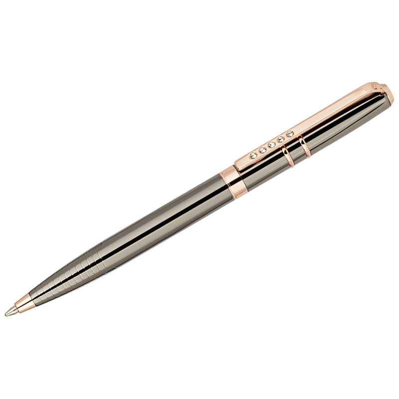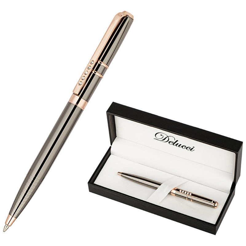 Delucci Sole – это роскошная подарочная шариковая ручка с синими чернилами, которую оценит любой человек. Медный корпус цвета оружейного металла украшен золотистыми кольцами. Клип из нержавеющей стали украшен кристаллами и позволит закрепить изделие на ежедневнике или кармане. Delucci Sole оснащена поворотным механизмом, внутри которого расположен пишущий стержень диаметром 1 мм, который идеально подходит для быстрого стиля письма. Упакована в футляр с откидной крышкой.