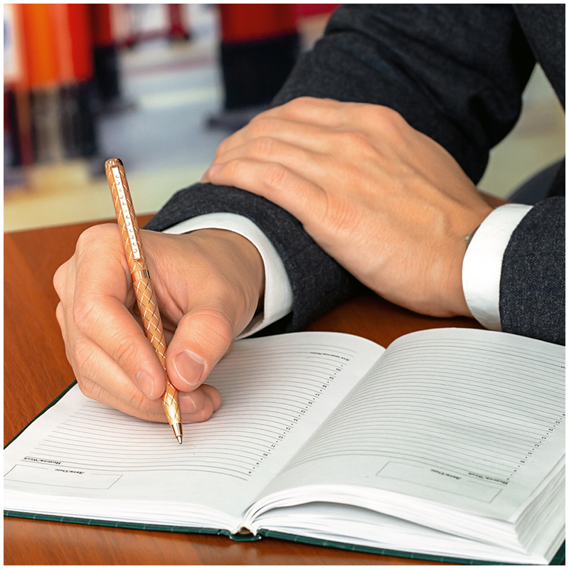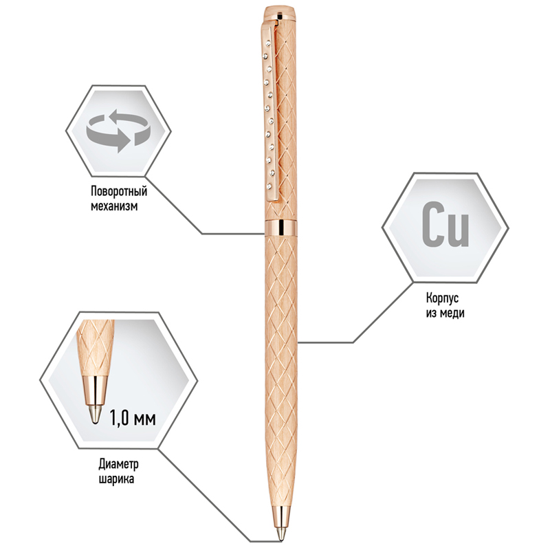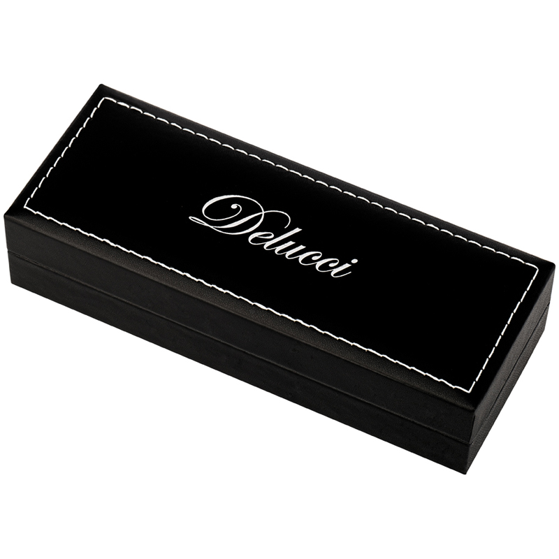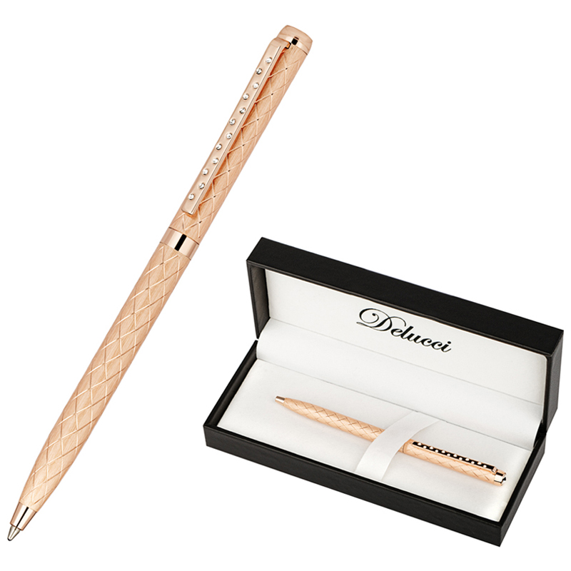 Delucci Aurora – это изысканная подарочная шариковая ручка с синими чернилами, которая точно придётся по нраву любой девушке. Тонкий золотистый корпус и аккуратный выгравированный орнамент придают ей изящности, а входящая в состав медь и никелированное покрытие отвечают за прочность изделия. Клип сделан из нержавеющей стали, он позволяет фиксировать ручку на ежедневниках, блокнотах и карманах одежды. Delucci Aurora оснащена поворотным механизмом, внутри которого расположен пишущий стержень диаметром 1 мм, который идеально подходит для быстрого стиля письма. Упакована в футляр с откидной крышкой.