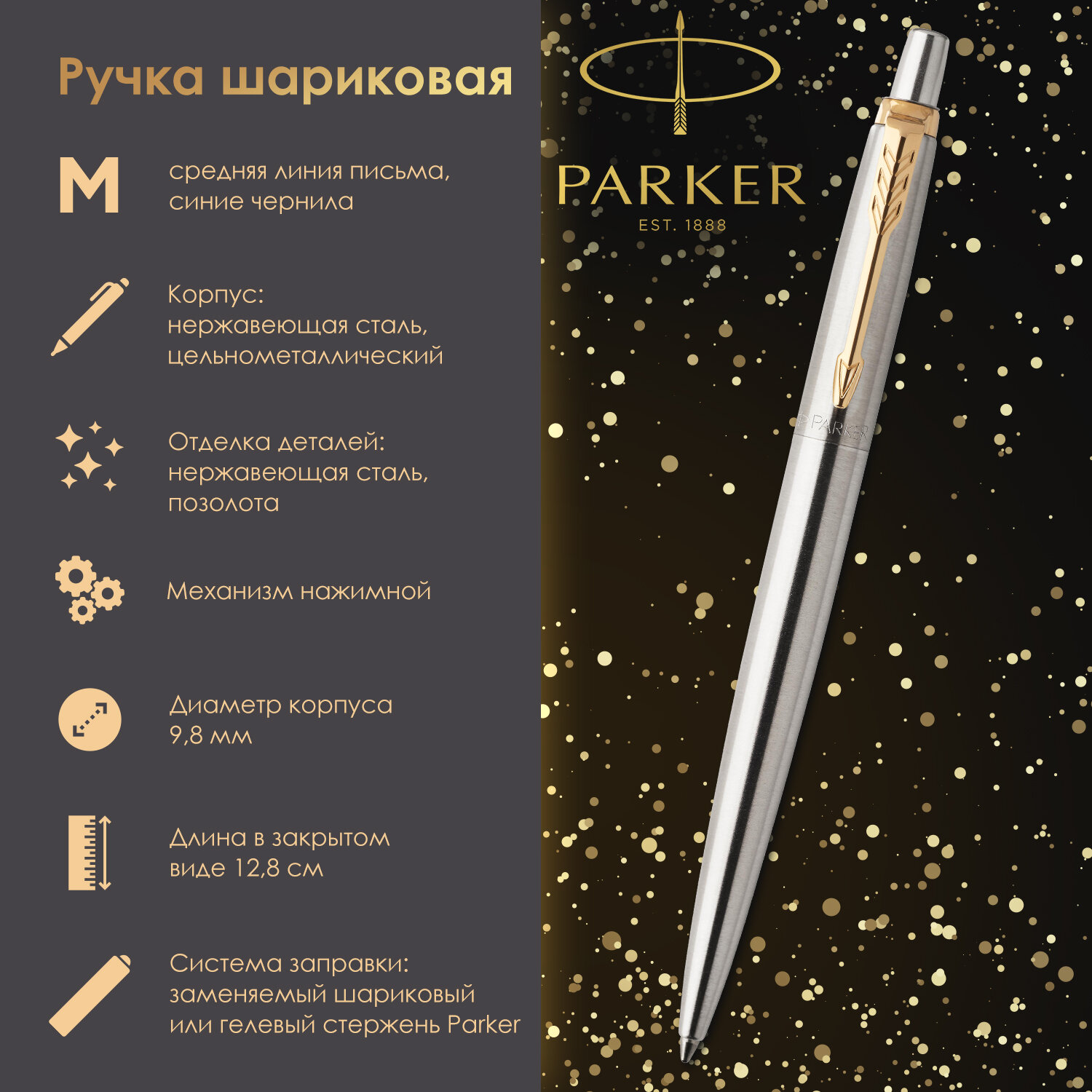 Шариковая ручка класса люкс Parker Jotter имеет корпус из нержавеющей стали. Детали отделки — сталь. Оснащена кнопочным механизмом. Комплектуется индивидуальным футляром и стержнем с пастой синего цвета. Диаметр шарика -1,0 мм. Толщина линии письма — 0,8 мм.