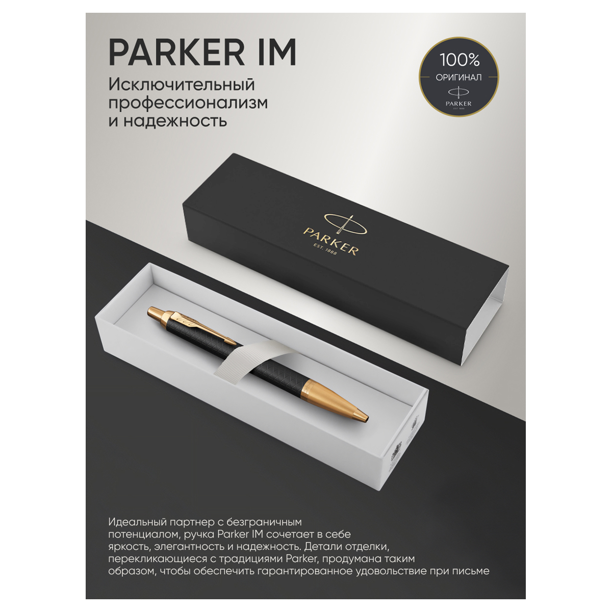 Шариковая ручка Parker IM имеет корпус из латуни черного цвета, позолоченные детали отделки и удобную зону захвата.