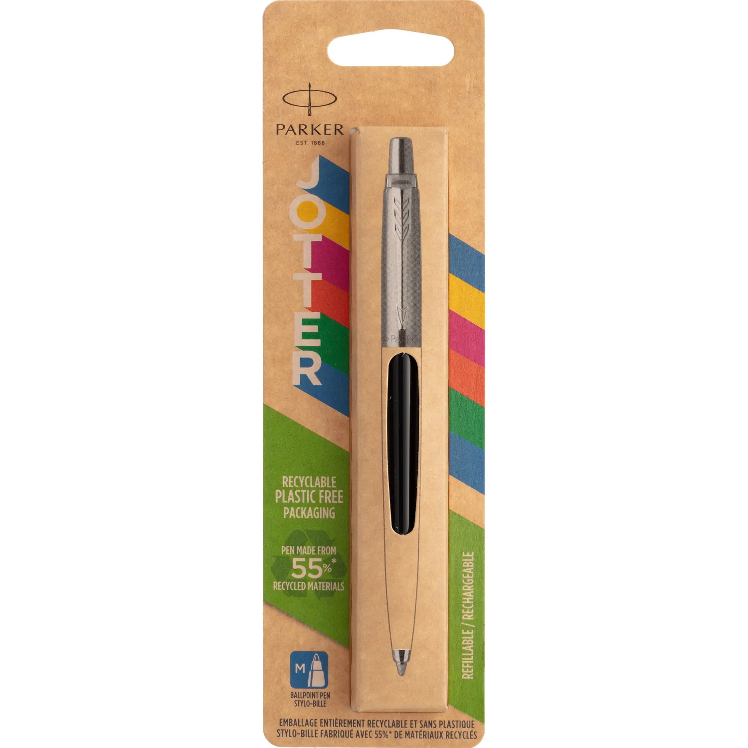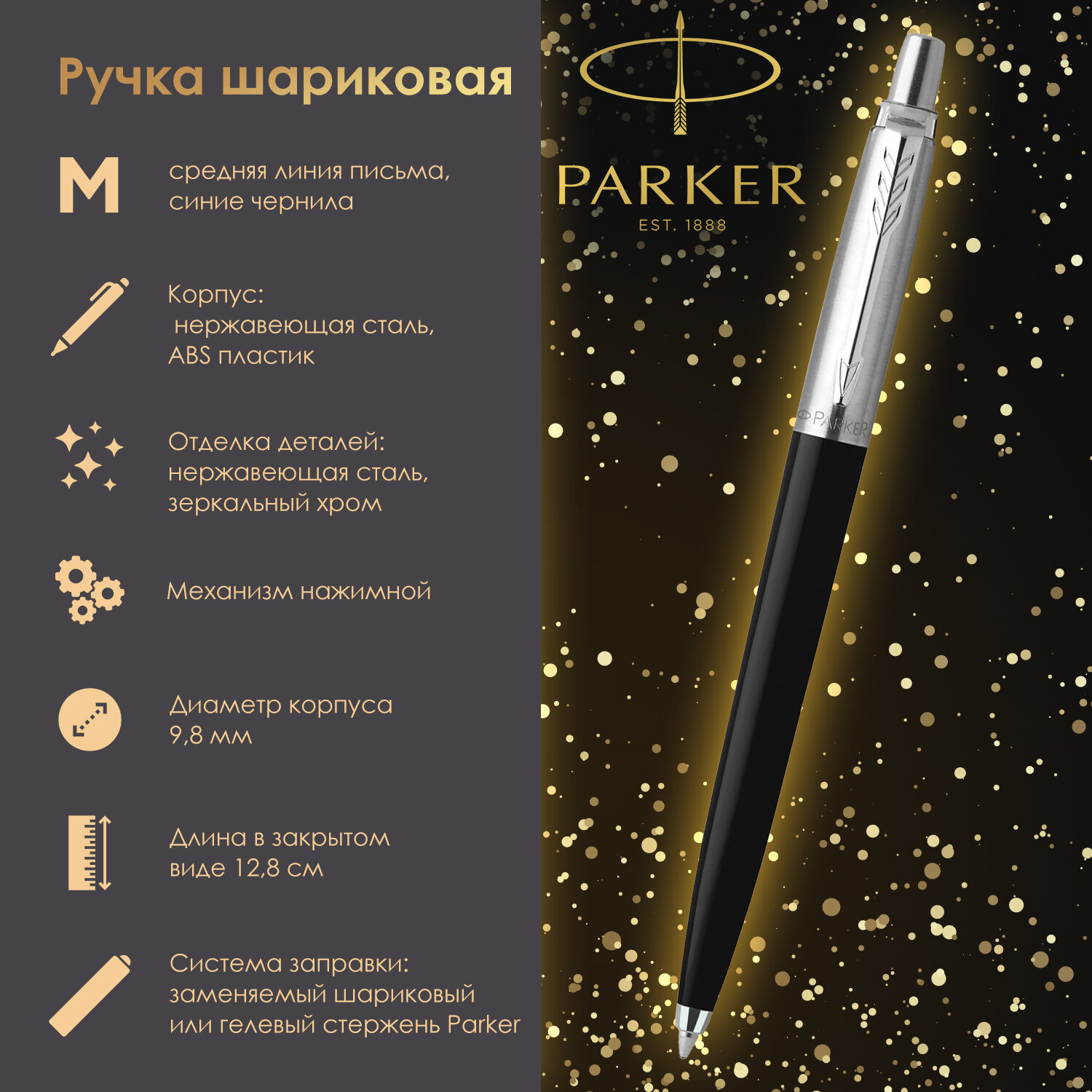Шариковая ручка Parker Jotter имеет корпус из качественной нержавеющей стали и долговечного пластика. Детали отделки — стальное покрытие. Оснащена кнопочным механизмом. Комплектуется стержнем с пастой синего цвета. Упаковка — блистер. Толщина линии письма — 0,8 мм. Parker создал ручку Jotter в 1954 г. Она имела исключительно вместительный стержень и шарик стержня, который изнашивался равномерно, что гарантировало долгий срок службы и отличное качество письма. На сегодняшний день продано более 800 млн экземпляров ручки Jotter. Произведена во Франции.