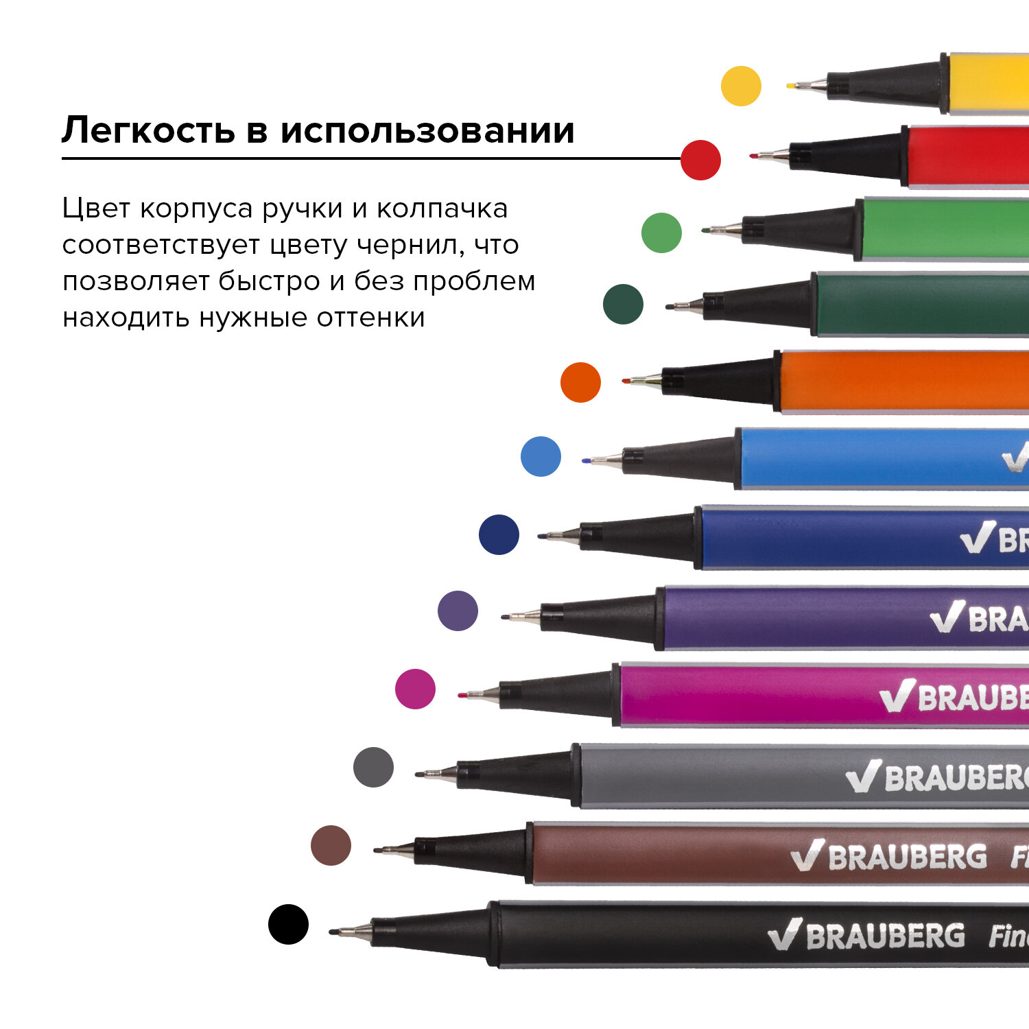 Набор капиллярных ручек (линеров) BRAUBERG 12 шт., АССОРТИ, "Aero", трехгранные, металлический наконечник, линия письма 0,4 мм, 141525