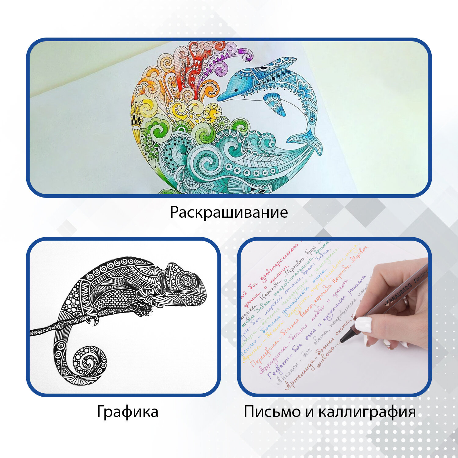 В наборе 12 штук ручек капилярных различных цветов. Трехгранная форма корпуса, диаметр которого 9 мм. Благодаря такой форме корпуса изделие удобно располагать в руке. Супертонкий износостойкий металлический наконечник 0,4 мм идеально подходит для создания точных и аккуратных линий. Цвет корпуса и колпачка соответствует цвету чернил.