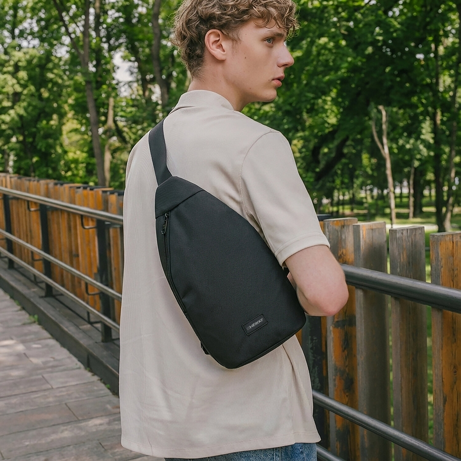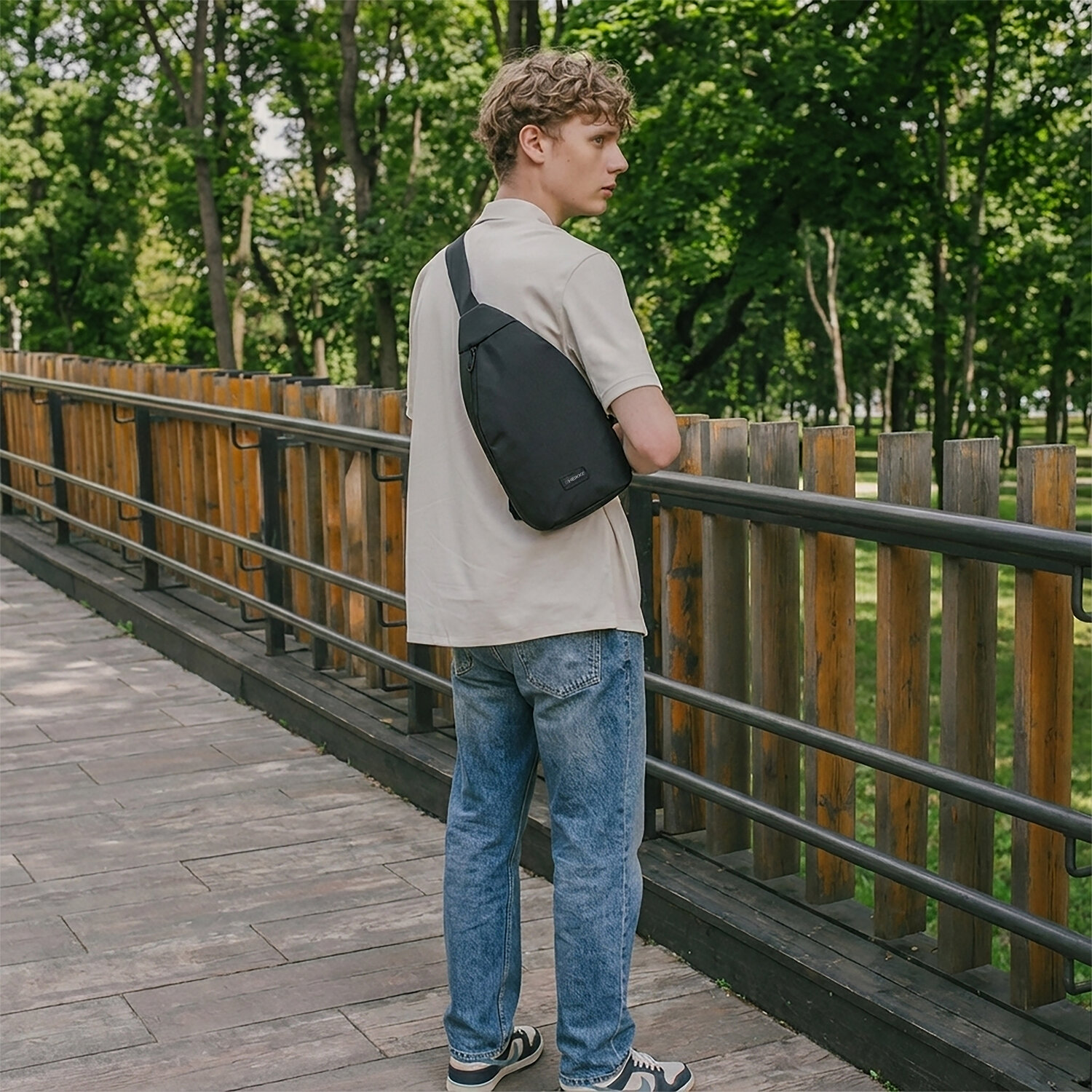 Изделие имеет два вместительных отделения. Основное отделение оснащено внутренним карманом, предлагая много места для повседневных вещей при небольшом размере. Пространства внутри достаточно для размещения смартфона, планшета до 10”, кошелька, ключей и других полезных мелочей.
