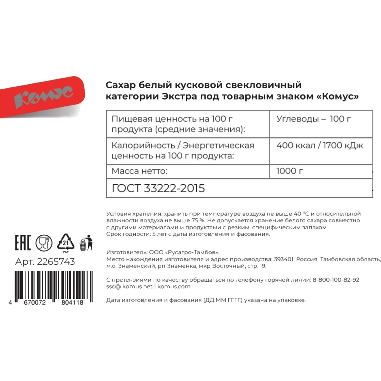 О товаре «Сахар кусковой Экстра Комус 1кг»