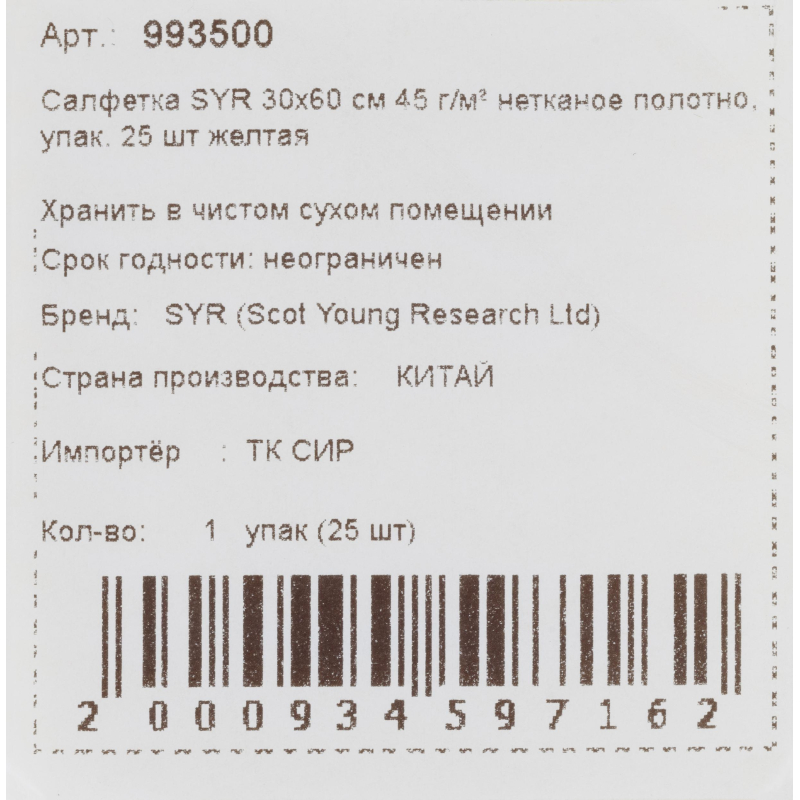 О товаре «Салфетки хозяйственные SYR вискоза 30x60 см 45 г/кв.м желтые (25 штук в упаковке)»