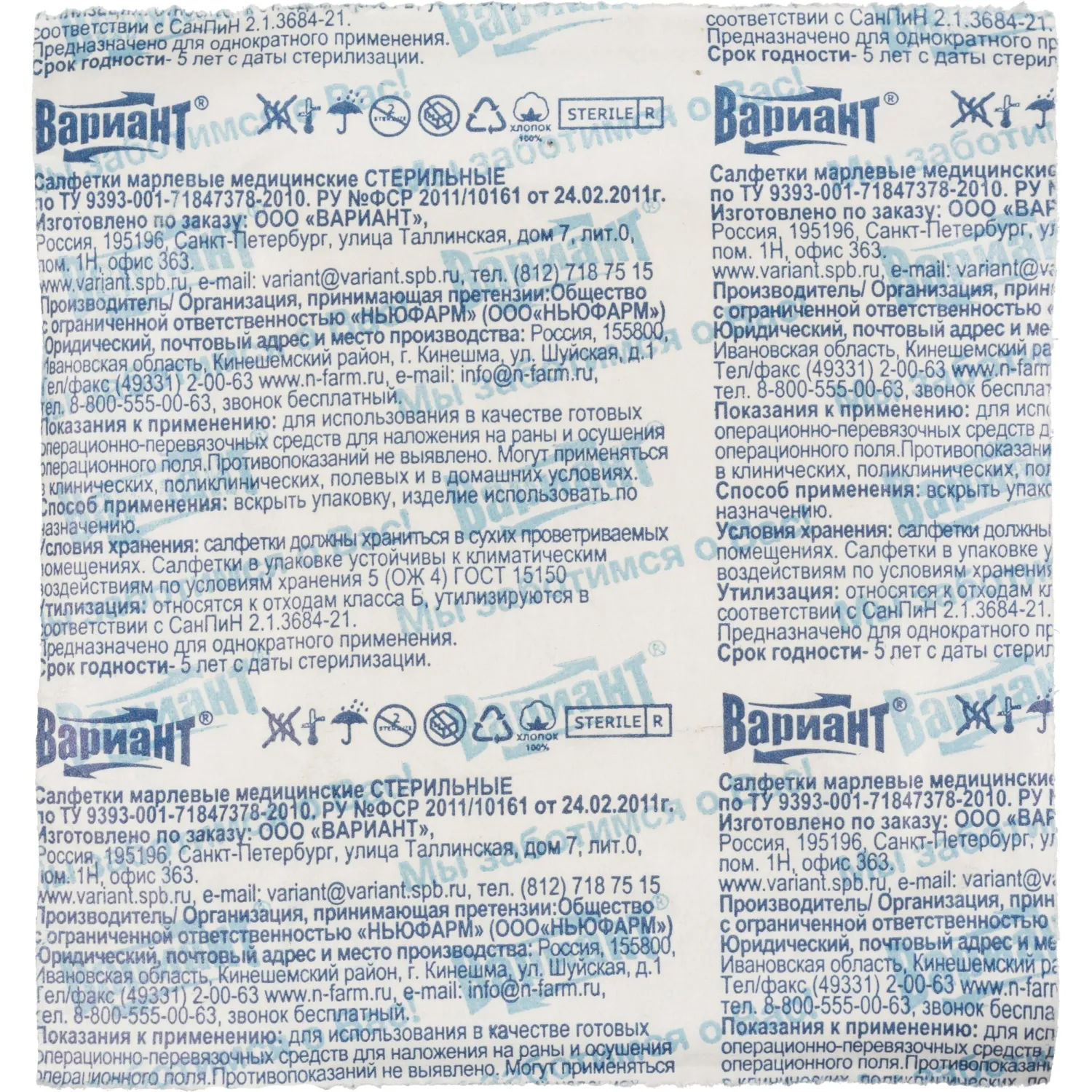 Изделие изготовлено из отбелённой медицинской марли из 100% хлопка плотностью 32 г/кв.м, соответствующей 17 нитям по европейскому классификатору. Салфетка имеет квадратную форму размером 5×5 см и состоит из 8 слоёв, края которых аккуратно загнуты внутрь для предотвращения осыпания волокон и обеспечения безопасности при контакте с раной. Стерилизация проводится радиационным методом, что подтверждается наличием протокола и инструкции по радиационной стерилизации медицинских изделий.
