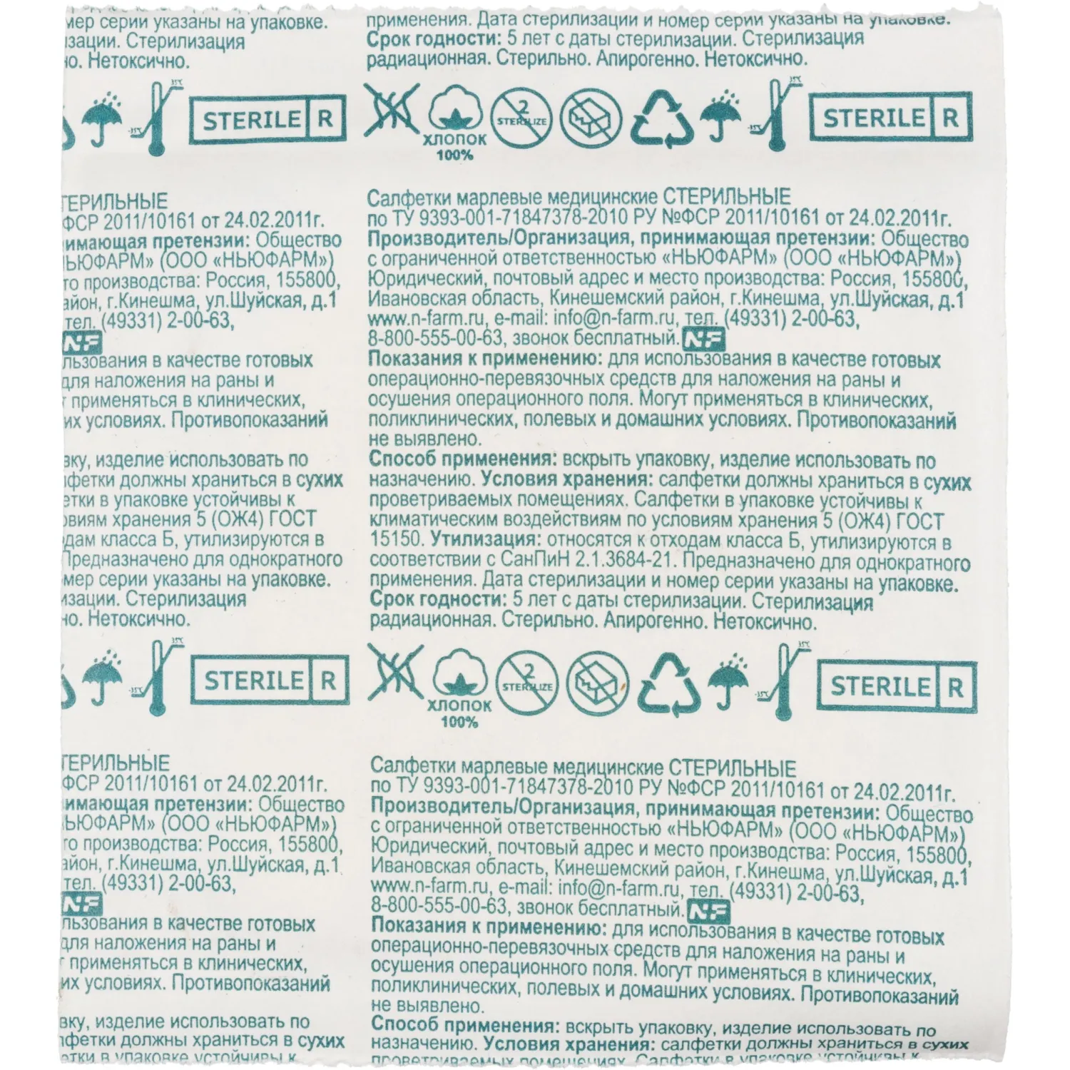 Изделие изготовлено из медицинской марли из 100% хлопка плотностью 32 г/кв.м. Материал мягкий, воздухопроницаемый и обладает хорошими впитывающими свойствами. Салфетка имеет квадратную форму размером 5×5 см и состоит из 8 слоёв. Стерильные салфетки упакованы в блистер, что гарантирует сохранение стерильности до момента вскрытия.