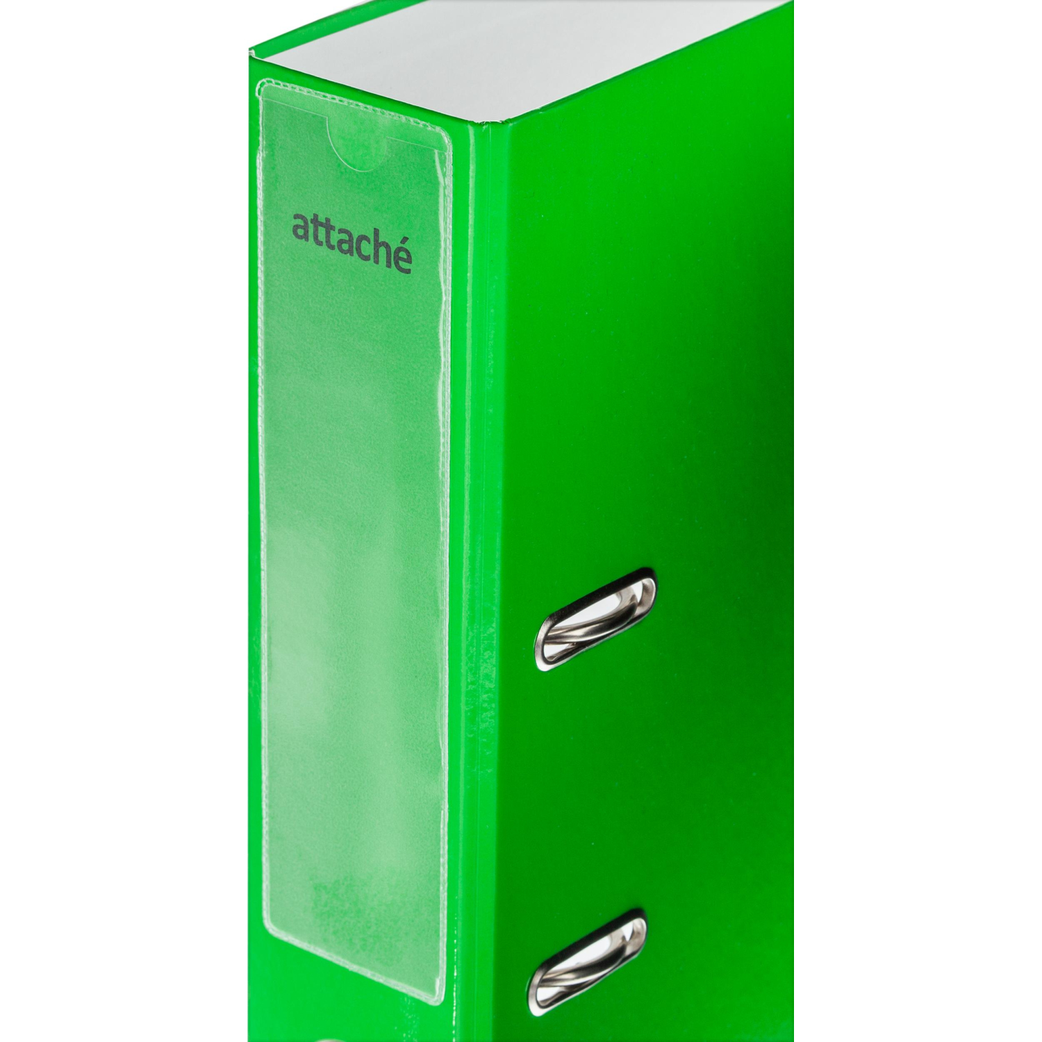 Самоклеящиеся прозрачные карманы Attache выполнены из ПВХ, размер — 191×50 мм. Предназначены для маркировки архивных папок. Оптимальны для папок с шириной корешка 70 мм, с ровной гладкой поверхностью. Также могут крепиться с внешней и с внутренней стороны обложки. Нижний лист кармана белого непрозрачного цвета, наружный лист кармана — прозрачный. В упаковке 10 карманов.