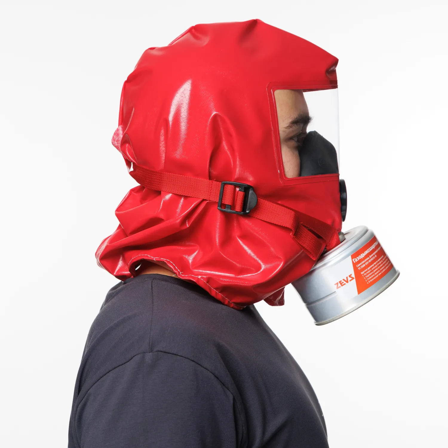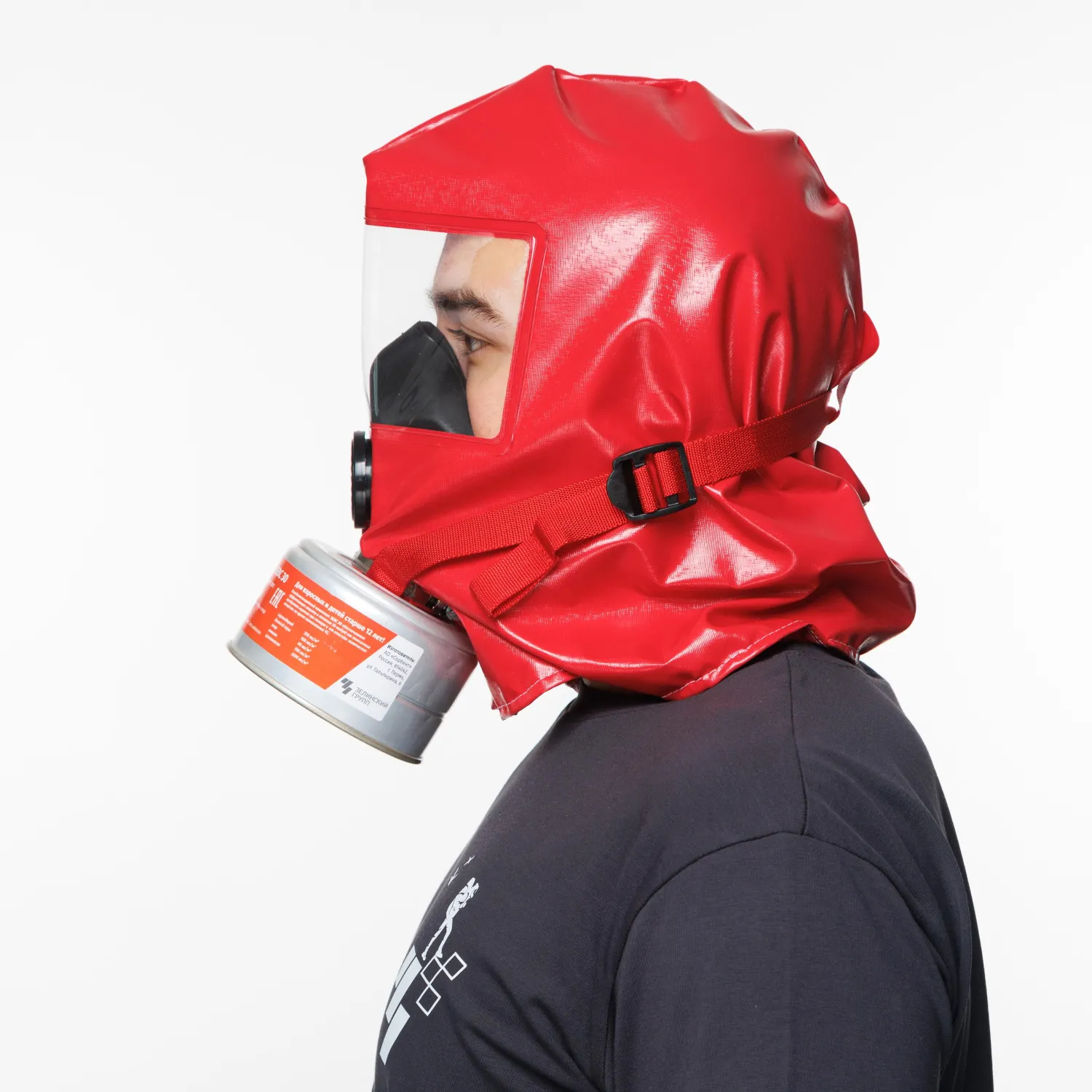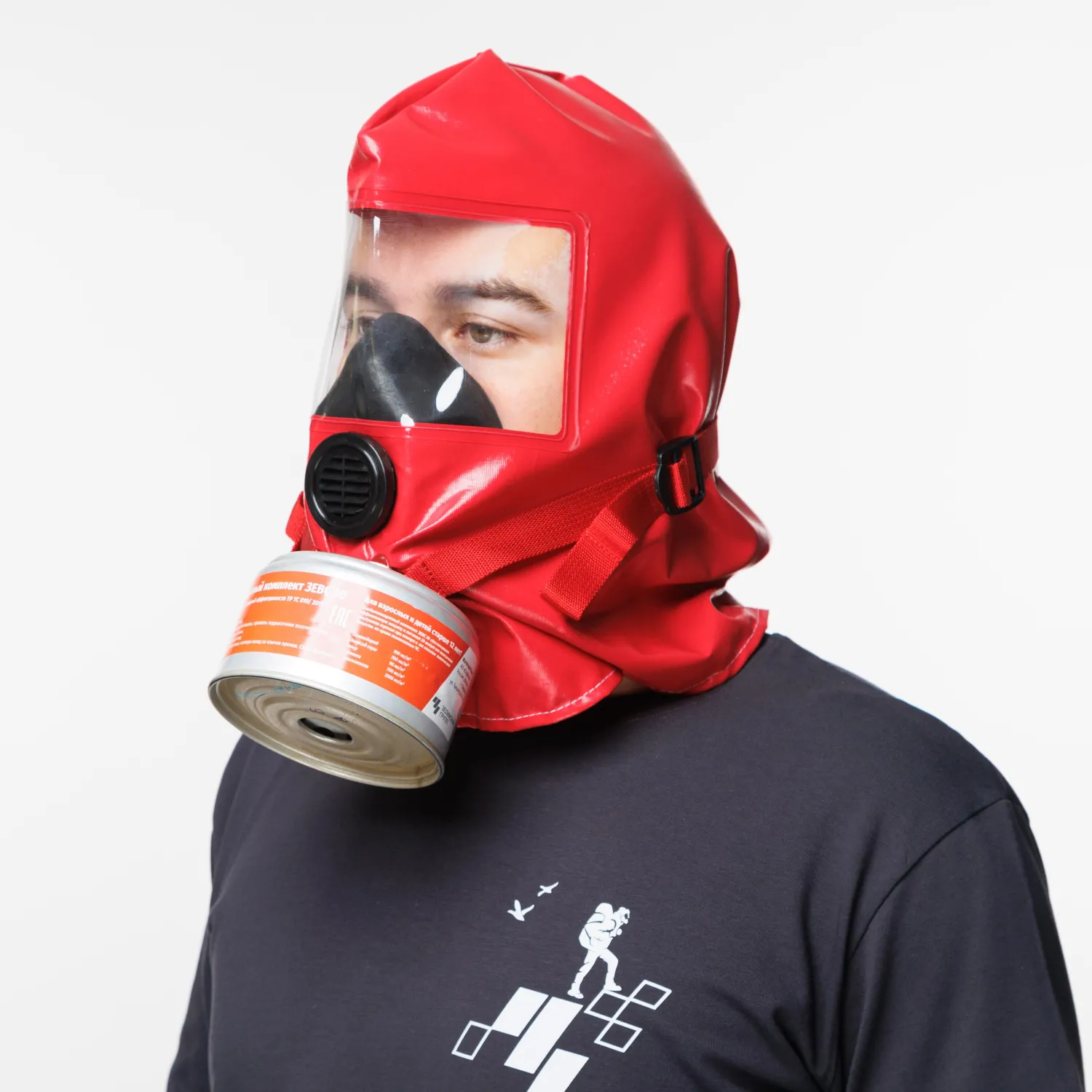 — огнестойкий капюшон со смотровым окном, внешним регулируемым оголовьем, эластичным шейным обтюратором, полумаской и клапаном выдоха;