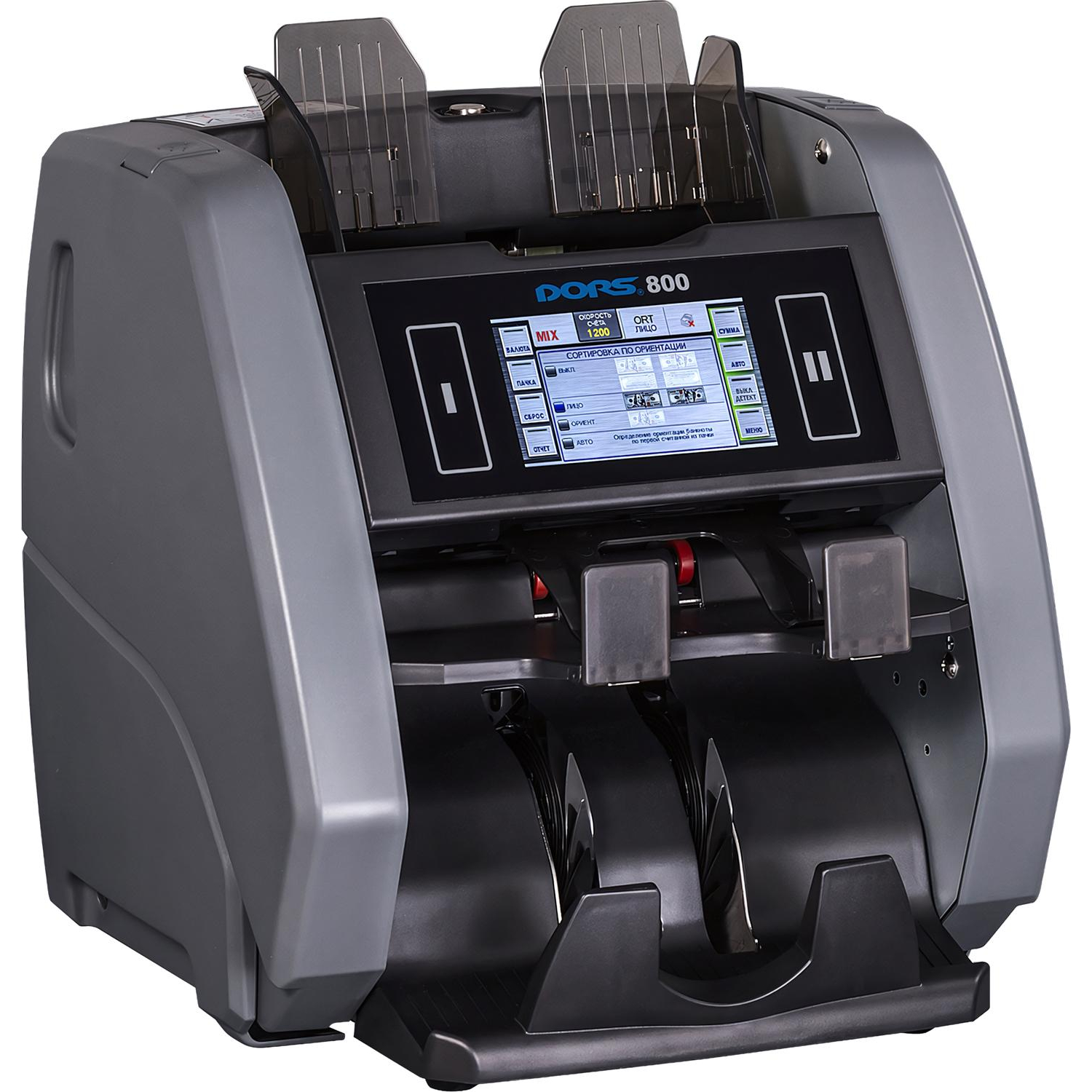 DORS 800 — это двухкарманный счетчик банкнот банковского класса с проверкой подлинности по четырем машиночитаемым признакам (ИК и видимое изображение, отсутствие фонового свечения банкнотной бумаги в УФ свете, наличие МГ меток), определением номинала, а также с функцией сортировки по номиналу и ориентации. Счетчик банкнот DORS 800 имеет цветной сенсорный дисплей с диагональю 4.3 дюйма с полной русификацией.