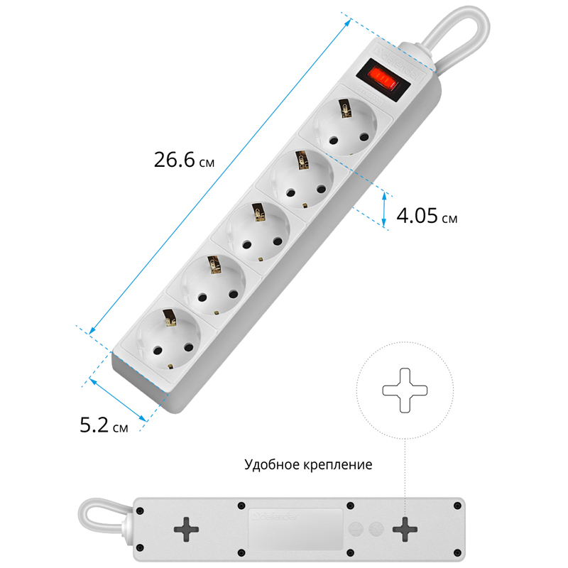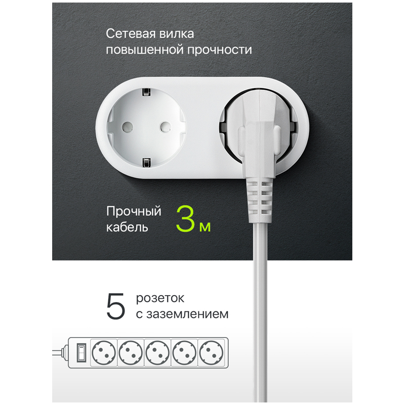 5 розеток, расположенных под углом, упростят подключение необходимого количества электротехники одновременно. Длина шнура составляет 3 м, максимальный ток нагрузки - 10 А, напряжение - 220 В, а частота напряжения - 50 Гц. Корпус выполнен из высококачественного, ударопрочного, негорючего пластика. Каждая розетка оборудована заземляющими контактами. Подобная защита исключает случайное поражение электрическим током, что особенно актуально, если в помещении, где используются электроприборы, есть дети. Стандартные размеры (277х53х40 мм) и вес (370 г) помогут с легкостью разместить сетевой фильтр.
