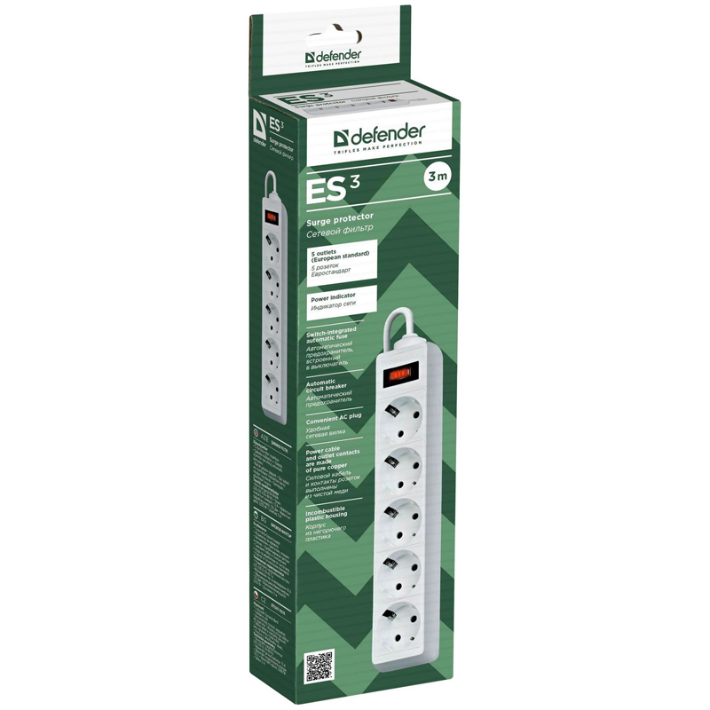 Сетевой фильтр Defender ES 3 на 5 розеток 3 метра белый (99482)